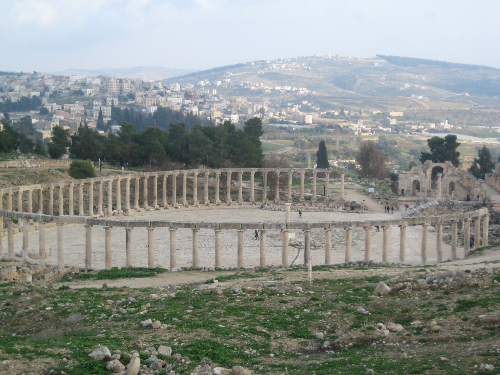 Discendiamo dopo aver goduto della visione di un pallido sole al tramonto tra le colonne del tempio. Scendendo, compiamo il percorso opposto a chi in età romana saliva al tempio, attraverso una porta monumentale che si affacciava sulla via colonnata e un’imponente scalinata che conduceva poi al piazzale antistante il tempio. Scendendo le scale e attraversando questa porta ci ritroviamo quindi sulla via principale della città, ornata dalle colonne di un lungo portico che in età romana la costeggiava. Camminando sull’antico basolato della pavimentazione stradale, giungiamo infine, tornando indietro, al foro ovale circondato anch’esso da un portico colonnato di cui restano le colonne unite tra loro da un lungo architrave. Ci avviamo quindi verso l’uscita, e in due o tre sgattaioliamo via più velocemente degli altri per correre nel bazar all’ingresso del sito: la nostra guida giordana, molto ferrea, non ci permette di comprare souvenirs perché si perde tempo…ma come si fa a tenere a bada delle giovani donne in terra straniera? E così comincio a comprare la mia prima boccetta di sabbia, opera di artigianato tipica della Giordania, non prima però di aver fatto un’incursione all’interno dell’ippodromo e di aver dato un’ultima occhiata alla monumentale porta di Adriano (che tra tutti, è il mio imperatore preferito!). Via, si parte! Rientriamo in serata ad Amman.