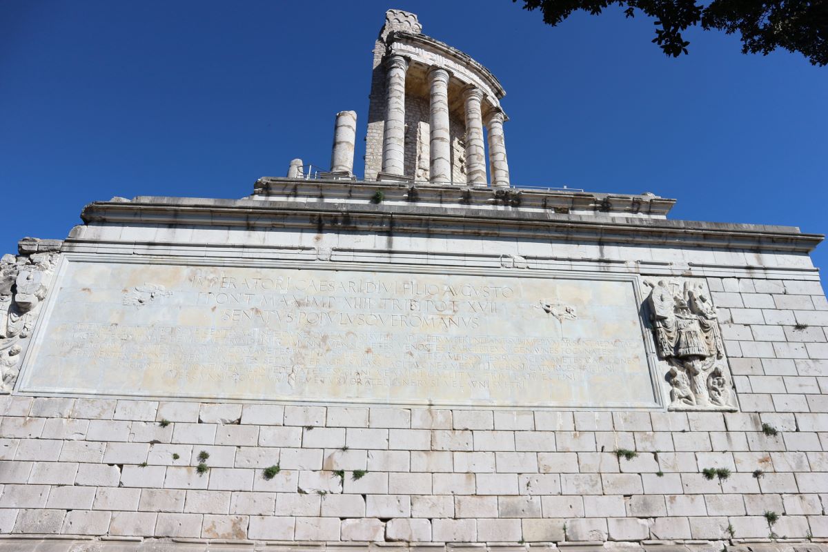 La Turbie è un piccolo borgo medievale splendidamente mantenuto e veramente grazioso che si avvolge intorno alla sommità su cui sorge il Trofeo delle Alpi o Trofeo di Augusto, un monumento fatto erigere appunto dall’imperatore Augusto quando finalmente i Romani riuscirono a sottomettere tutti i popoli delle Alpi (che erano duri a morire). Per celebrare la vittoria e a monito contro chi mai volesse schierarsi contro Roma, fu quindi eretto questo monumento gigantesco, di cui oggi rimane ben poca cosa, seppur ancora spettacolare, che si vedeva a miglia di distanza e che sovrastava il passaggio della via romana, la via Iulia Augusta che arrivava in Gallia. Chiunque passava non poteva non vedere questo monumento enorme, così come oggi, chi passa anche in autostrada lo individua a diversi km di distanza.