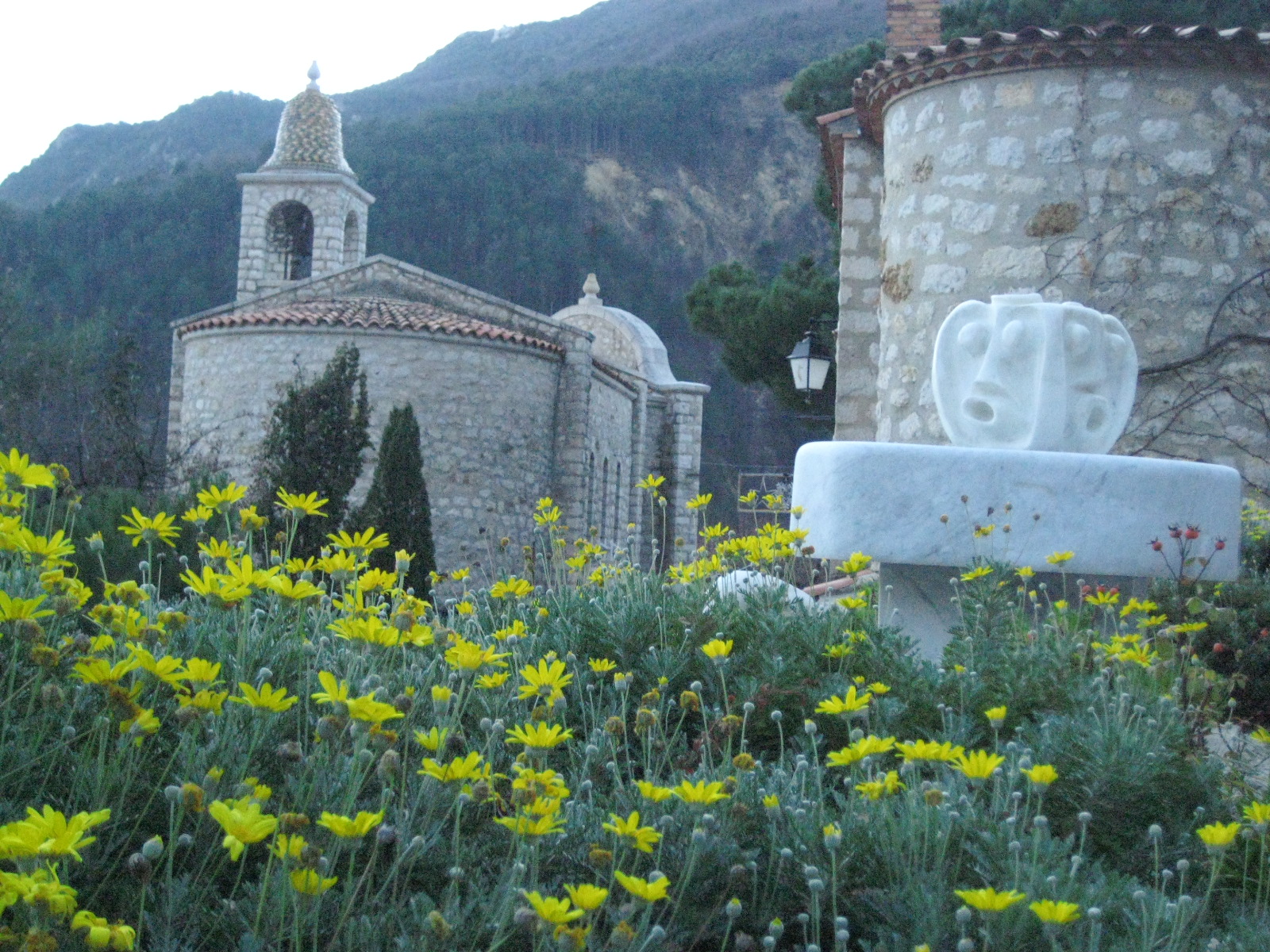 Ha una piccolissima chiesa dalla forma alquanto inconsueta: tondeggiante, tutta curva, che segue l’andamento del costone di roccia su cui poggia piuttosto che qualche regola architettonica. È dedicata a San Michele. Di fronte, sulla piccolissima piazzetta, si affaccia il birrificio di Castillon. Poi la strada prosegue, ma non va molto oltre. Il paesino è davvero piccino, costellato da piccole sculture, a ricordare che ci troviamo nel paese degli artisti.Vale comunque la pena di soffermarsi un attimo, prima di procedere verso Sospel, vale la pena di affacciarsi dallo sperone di roccia e guardare giù verso il mare, ormai ridotto ad un triangolino blu lontano. Il clamore della città e della vita mondana sulla costa è ormai lontano. Qui siamo alle porte della montagna, dove regna la pace e la tranquillità, dove il rumore non esiste, dove la calma e la serenità avvolgono ogni cosa.