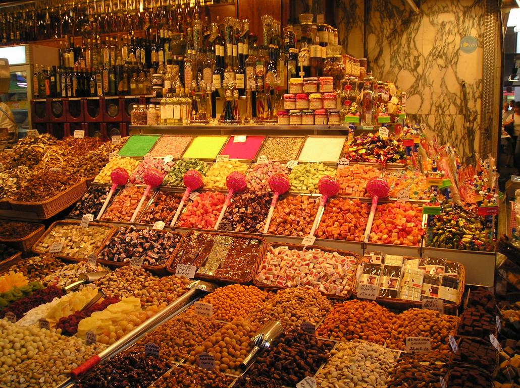 É il mercato coperto più famoso di Barcellona. Già l’entrata fa capire che si tratta di qualcosa di eccezionale, con la sua vetrata modernista che indica, appunto, il “Mercat de la Bouqueria”. E all’interno, si è catapultati in un mondo di colori e sapori, di gente indaffarata dietro al bancone e di clienti accalcati davanti alle ceste di frutta, di funghi, di caramelle.