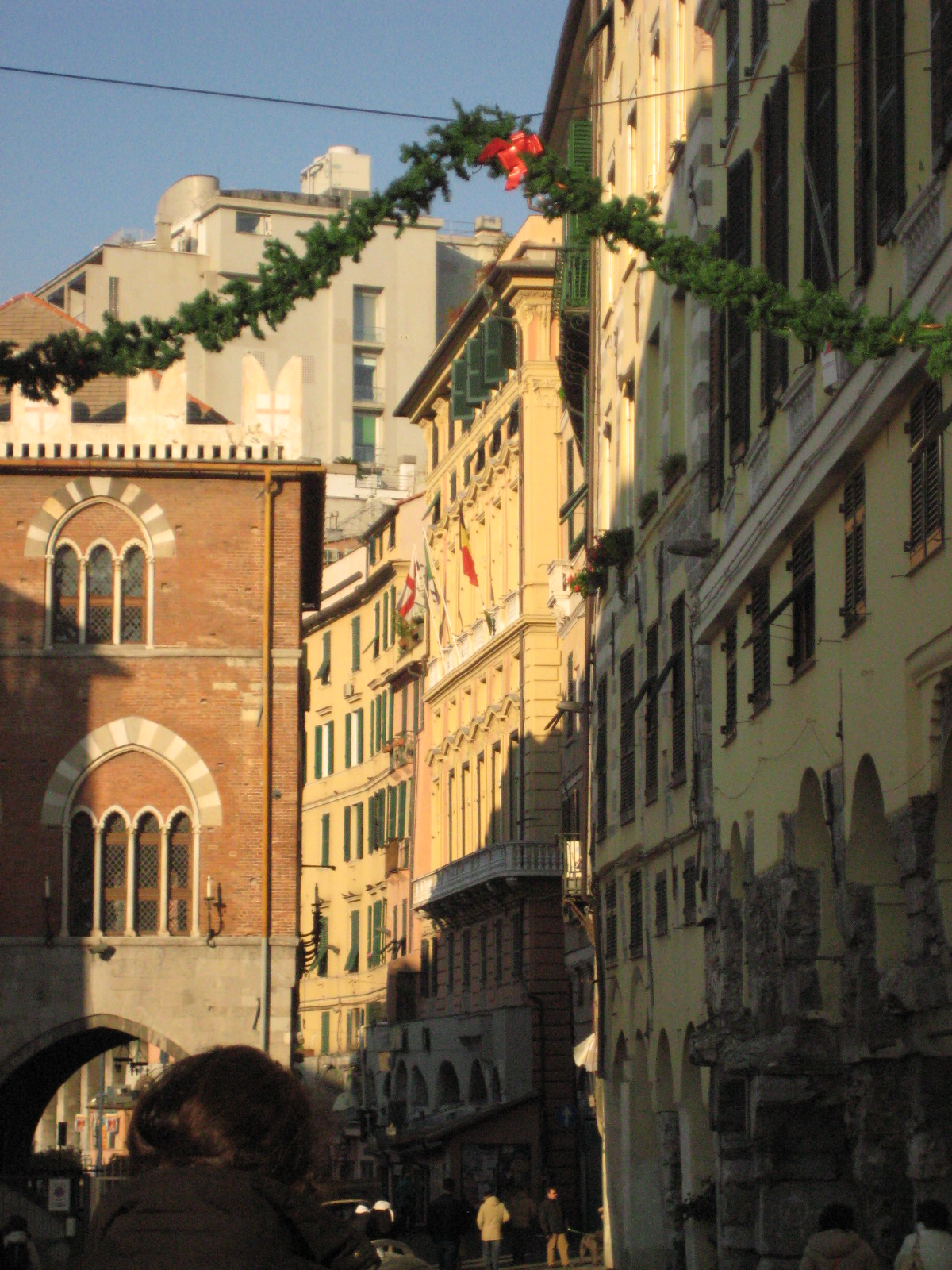 Infilandosi in via del Campo e percorrendola tutta si sbuca in piazza Campetto. Noteremo che già qui i palazzi che si affacciano su questo vicolo hanno un non so che di antico e solenne. I palazzi di fatto all’interno nascondono splendide scale abbellite da colonnine di sostegno: una volta, e parlo di secoli fa, dovevano essere bellissime. Oggi devono recuperare la bellezza di un tempo, e dio solo sa se riusciranno, un giorno. A piazza Campetto conduce anche l’altro ingresso al centro storico, la larga via Lomellini, che costituisce la seconda delle due strade che si dipartono dalla zona della Nunziata. Da questa piazzetta uno stretto vicolo porta ai portici che danno sul mare, ovvero in Sottoripa, i cui splendidi palazzi, di cui non è possibile avere piena percezione finché vi si cammina al di sotto, sono splendidi a vedersi dalla sopraelevata (croce e delizia della città, odiata dai genovesi perché taglia il panorama del mare, ma ottima possibilità per chi la percorre di vedere palazzi altrimenti invisibili): le murature sono un puzzle di taglia e cuci, di arcate richiuse e finestre riaperte, di rattoppi e di decorazioni, di bifore e merlature, una meraviglia per chi un minimo ama l’architettura, in particolare medievale.