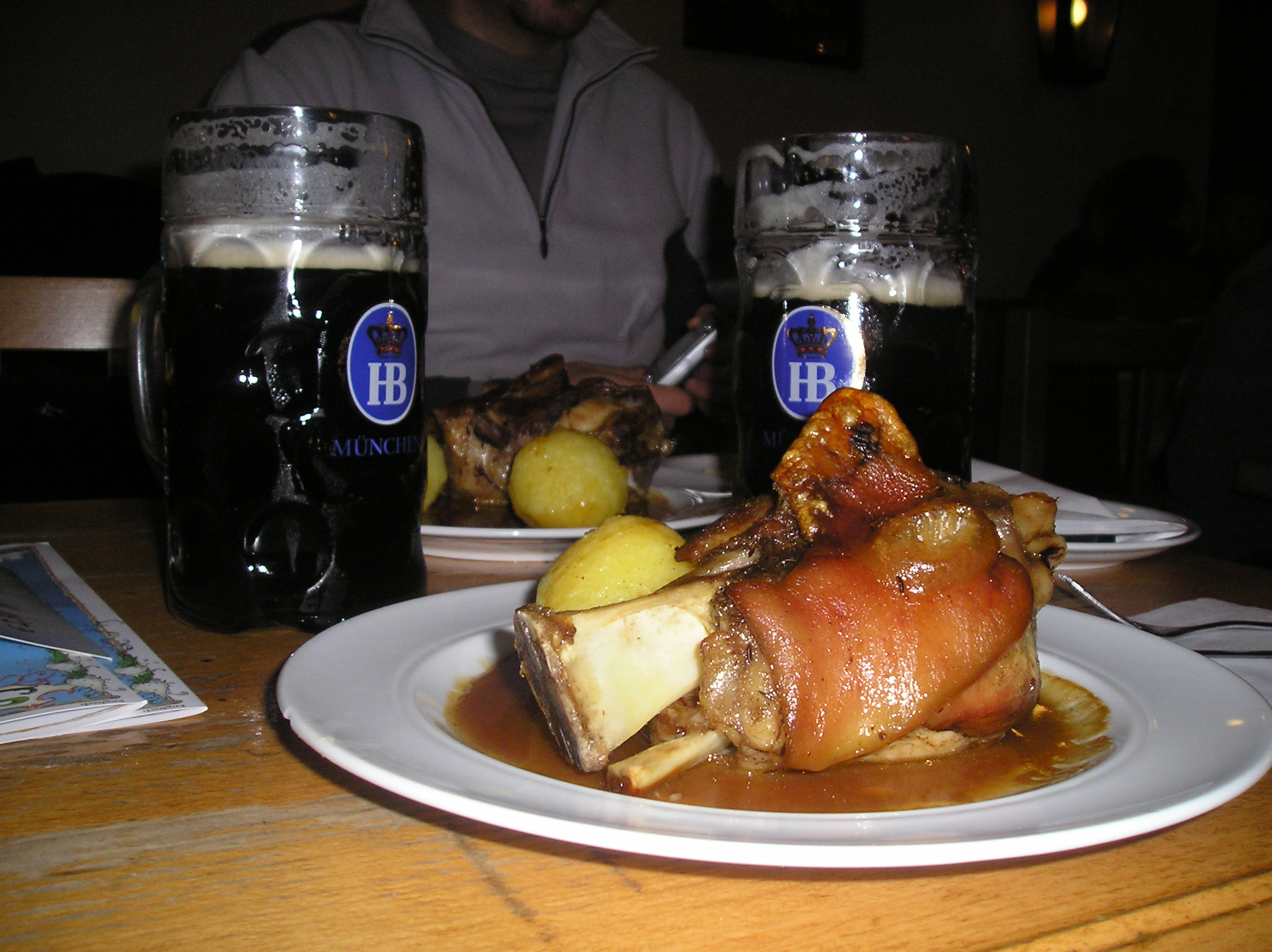 Dopo il pomeriggio culturale ci ributtiamo nelle vie del centro, che ormai conosciamo a memoria. E qui sfidiamo noi stessi: alle 18.15 entriamo nella birreria della Paulaner vicino a Marienplatz e facciamo aperitivo con 0,5 cl di Paulaner Hefe Weißbier Naturtrüb accompagnato da un brezen, un pane fatto a fiocco decorato e insaporito con sale grosso. Non paghi, usciti da lì (e sono quasi le 20!) decidiamo di andare a cena di nuovo alla Hofbräuhaus, e lì un altro litro di birra non ce lo leva nessuno! Questa sera però cambiamo menù e ci spariamo una piattata di wurstel cui facciamo seguire nuovamente lo strudel che ieri c’è piaciuto tanto. Inutile dire che ci siamo innamorati di questo posto e così anche stasera come ieri ce ne torniamo in hotel a dormire, gonfi e barcollanti dopo 1,5 l di birra trangugiata in una serata sola.