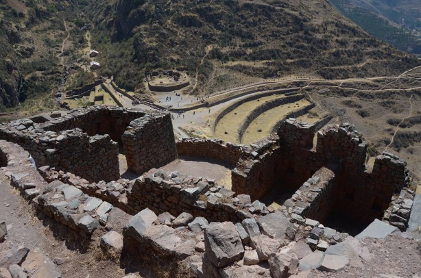 Il tour si rivela una mezza fregatura, innanzitutto perché per venderci il prodotto Carlos ci ha detto che il giro turistico, dopo averci fatto visitare le poderose rovine Inca di Ollantaytambo, ci avrebbe portato vicino alla stazione del treno, cosa che non è stata così, in secondo luogo perché avremmo voluto dedicare più tempo al famoso mercato domenicale di Pisac, che invece è stato quasi una toccata e fuga. Ma andiamo con ordine. La guida è informata che noi dobbiamo prendere il treno alle 15.37 (in stazione mezz’ora prima) e ci dice fin dall’inizio che non riusciremo a vedere le rovine di Ollantaytambo. Sgrunt. Vabbè, pace, ormai incazzarci non serve. Vediamo almeno di goderci il mercato di Pisac. Intanto, però, il pullman si ferma nel piccolo paese di Qollao, noto per la produzione ceramica. Peccato che di ceramica non ci sia nemmeno l’ombra, mentre c’è l’ennesimo mercatino nel quale noi, gregge di turisti evidentemente visto solo come un mazzo di soles facili da fare, veniamo buttati. La cosa ci indispone non poco: perché se ci fermiamo al mercatino qui, non è che quello di Pisac passa in cavalleria? A Pisac ci andiamo, sì, ma a visitare, molto brevemente, le belle rovine inca che si addossano al fianco della montagna: più in basso le andenes, gli ormai familiari terrazzamenti inca, e sulla sommità l’insediamento, che posto così in alto poteva controllare la valle da una posizione privilegiata, avendo visibilità a 360°.