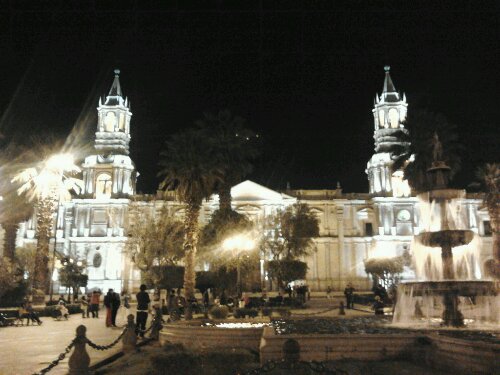 Arriviamo ad Arequipa quando ormai sta calando la notte. Mentre l’aereo si abbassa vediamo le luci della città che si stende alle pendici dei suoi vulcani: una lingua arancione nel buio, mentre ancora si stagliano nella penombra le cime dei vulcani innevati. La vista ha un che di magico.
