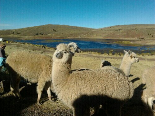 Il sito archeologico è sull’altura, e durante la salita, a piedi, incrociamo un gregge di alpaca guidato da una bambina che ci chiede un sol per poter fotografare. È il prezzo da pagare, ma vale il prezzo del biglietto la possibilità di passare in mezzo al gregge: non sono più grossi delle pecore, solo hanno il collo lungo e l’espressione sorridente. Qualcuna ha gli occhi azzurri.