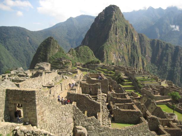 Restiamo a godere questo panorama per quanto? Un bel po’: il cielo è coperto, ogni tanto una nuvola più bassa delle altre passa sulla città rendendo ancora più irreale l’atmosfera. Saliamo sempre più su, di terrazza in terrazza, e arriviamo fino all’imbocco del sentiero per il ponte Inca: un ponte levatoio in legno che si può vedere solo da lontano da quando un tale c’è morto nel tentativo di attraversarlo. Il sentiero, lungo il pendio della montagna, è nella foresta, molto bello e per nulla faticoso. Ritorniamo al Posto di vedetta e prima di affrontare la visita della città inca, ci poniamo il problema di dove procurarci l’acqua in quanto, avendo dato retta alla Lonely Planet, che dice che è proibito portare acqua e cibi all’interno del sito, non ci siamo portati nulla, confidando di poter trovare qualcosa all’interno. Ciò che la Lonely Planet non dice è che forse è proibito davvero, ma dentro il parco la gente mangia tranquilla e beve dalla propria bottiglietta. Sgrunt. Inizia la ricerca, chiediamo ai guardiani che ci indirizzano al bar fuori dal parco. Così andiamo. Si può uscire e rientrare al parco quante volte ci pare, l’importante è esibire ogni volta il biglietto, che è giornaliero. Al bar l’acqua costa la bellezza di 8 soles (mentre il panino più scarso costa 25 soles, circa 8 €…), ma tant’è si piglia e ritorniamo dentro, a iniziare la nostra visita vera e propria.
