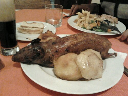 Il viaggio del ritorno arriva fino a Poroy, la stazione più vicina a Cusco ed è, da Ollantayambo in avanti, al buio. A Poroy ci accodiamo ad una coppia di Italiani incontrati più volte nel corso del tour che, più astutamente di noi, hanno prenotato un taxi che li venisse a prendere. Tralasciando il fatto che il taxista cerca di farci il busco perché pensa che aver portato nello stesso posto 4 persone invece che 2 gli dia diritto a doppia riscossione, arriviamo a Cusco in tempo per cena. E dove andiamo, se non a Los Tomines, che ci aspetta a braccia aperte? E stasera lo faccio, ebbene sì, lo faccio. Ordino un cuy al horno. Cos’è un cuy? In Inglese si chiama Guinea Pig, è …il nostro porcellino d’India, un po’ più grosso, forse, ma comunque un animaletto che a vederlo dal vivo è così carino… e che cotto è davvero delizioso! Ed è un piatto tipico da queste parti, ok? Non sono un mostro!