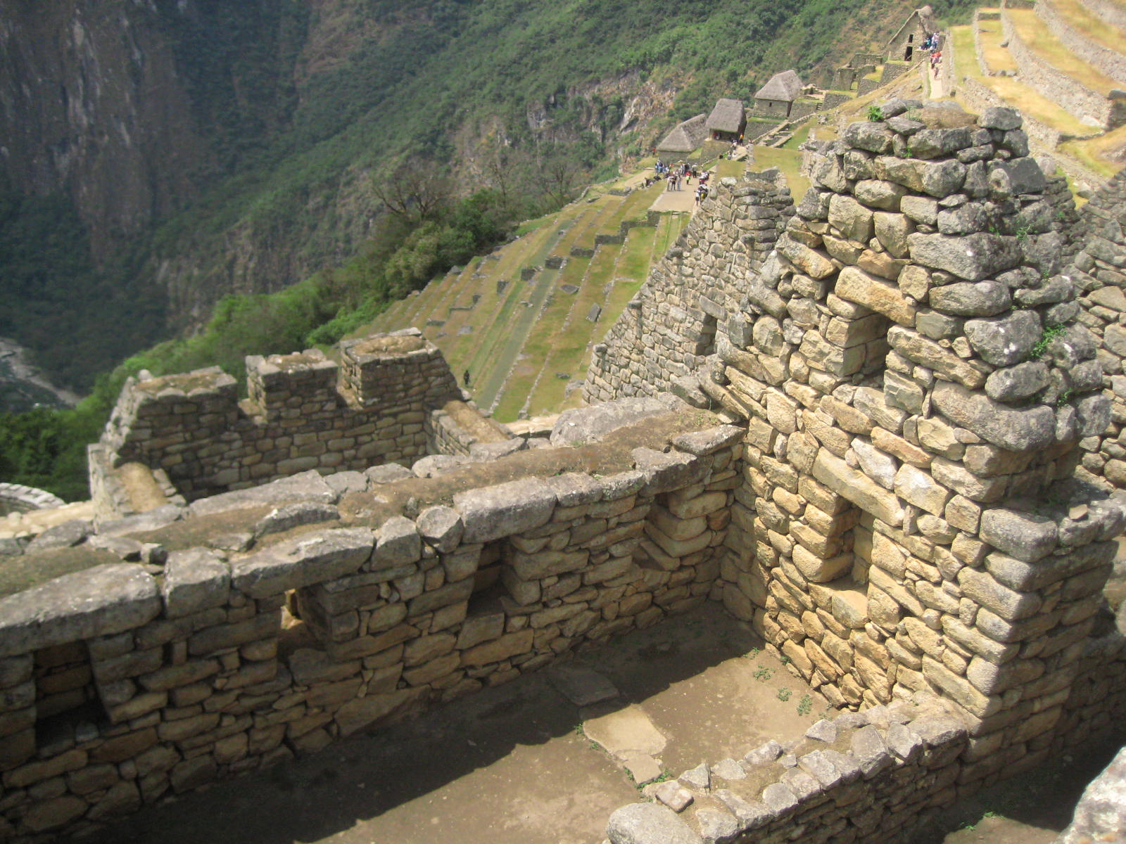 La visita inizia, dopo aver percorso dall’entrata una delle andenes del settore agricolo della città, dove può capitare di veder pascolare dei lama, dalla porta di accesso alla cittadella vera e propria, che è separato dal settore agricolo dal cosiddetto fossato secco e chiusa da un poderoso muro in opera poligonale inca, ovvero con grosse pietre di varia forma perfettamente incastrate tra loro. Il primo settore che si incontra è il cosiddetto Gruppo Alto, un probabile quartiere abitativo, con edifici a 1 o 2 piani, ma muri in pietre più piccole legate con terra.