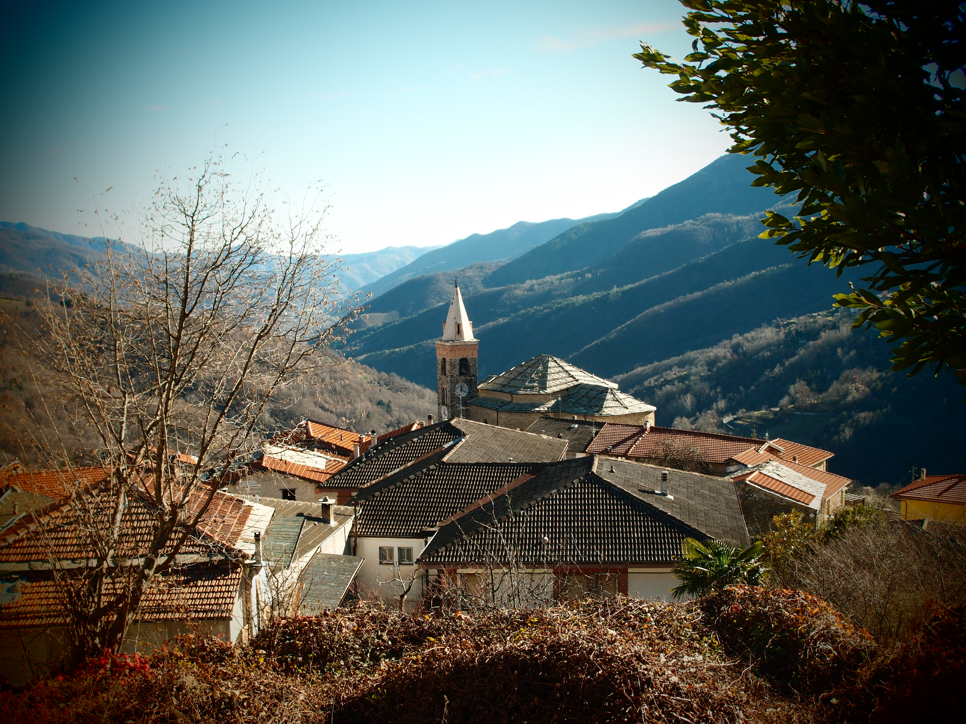 Siamo stati a Mendatica (IM) all’inizio di Gennaio, in una bella e calda giornata di sole, piuttosto piacevole qui, alle pendici delle Alpi Marittime: gli impianti sciistici di Monesi sono a pochi Km, mentre il paese, a 800 m slm, dista 40 minuti circa da Imperia, quindi dal mare, lungo una via che attraversa un entroterra fatto dapprima di oliveti, poi di boschi, e da una serie di paesini e borghi abbarbicati alle loro colline, poche case in mezzo alle quali svetta il campanile.