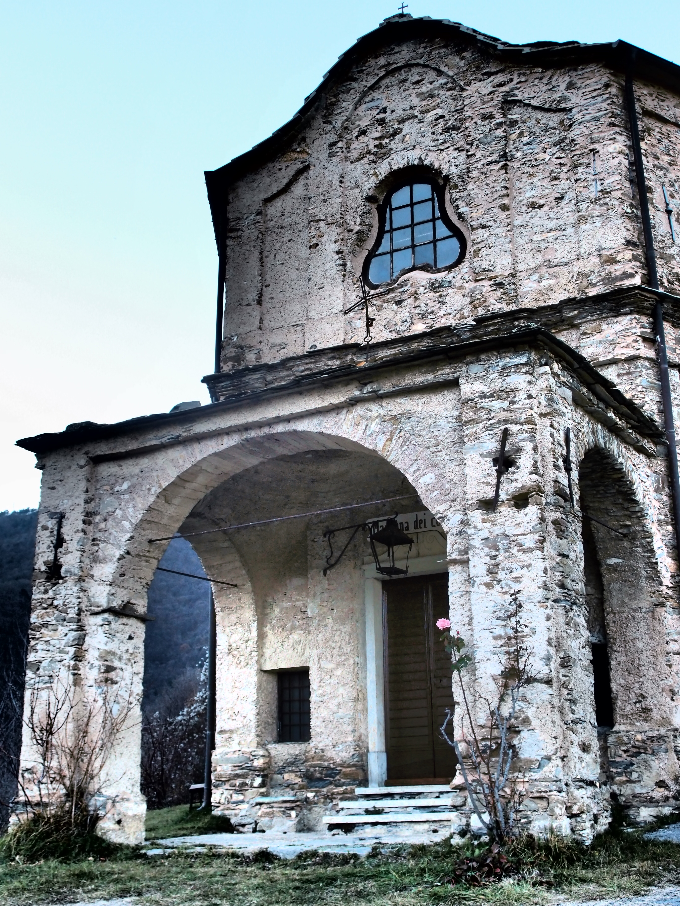 Dopo aver visto Mendatica dall’interno decidiamo di vederla dall’esterno: raggiungiamo la poco distante chiesetta della Madonna dei Colombi, su un poggio di fronte al paese, da cui si gode una splendida vista panoramica sul borgo e sulle montagne innevate al di sopra di esso. La chiesina è piccolina, ed ha un’architettura piuttosto ricorrente nelle pievi del territorio, con un piccolo arco davanti all’ingresso che offriva riparo a chi passava di qui e voleva riposare dicendo magari due preghiere.