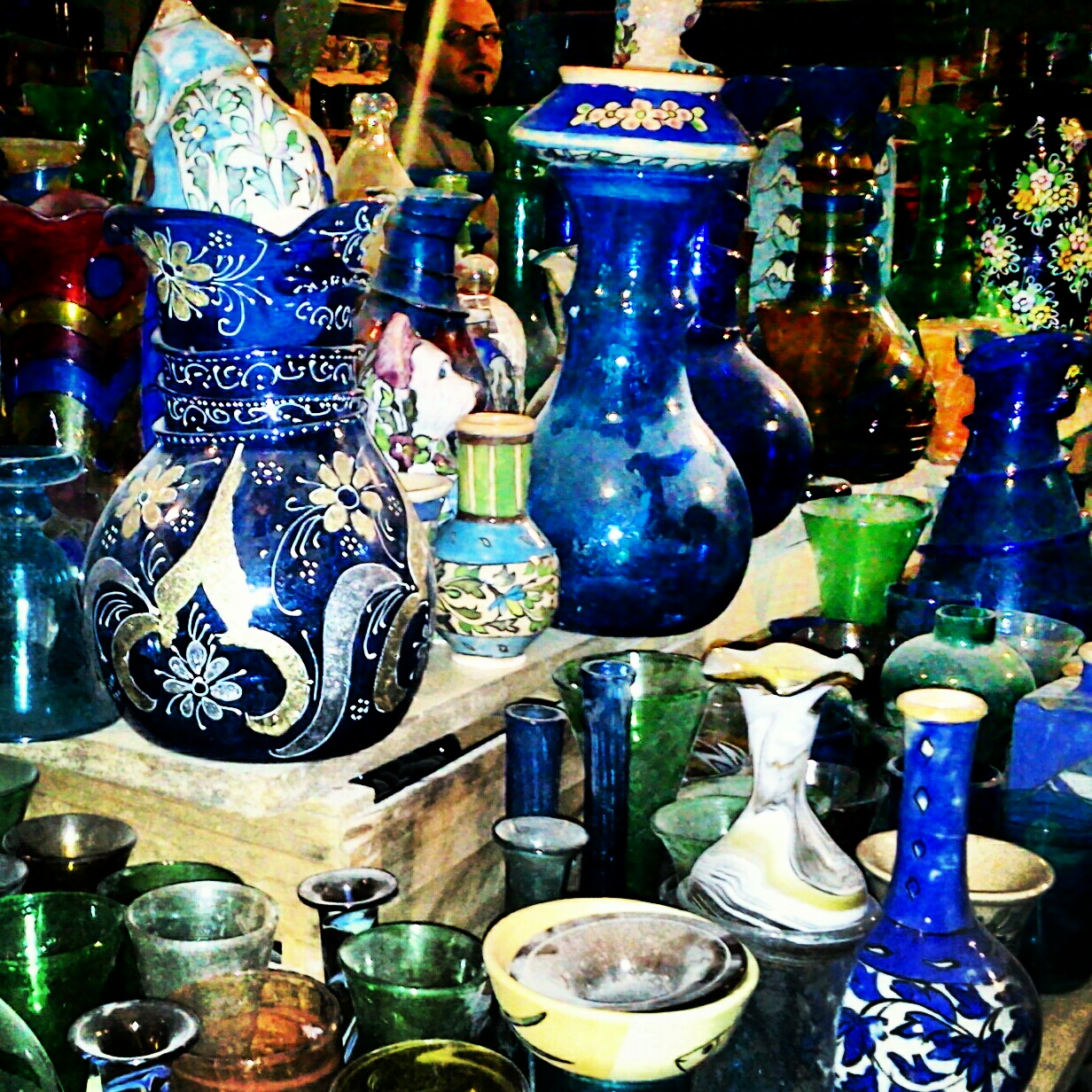 Qui c’è davvero di che rifarsi il servizio di bicchieri e di scodelle: la scelta è vastissima, i bicchieri da té alla menta tipicamente maghrebini sono bellissimi, verdi con le dorature damascate, le bottiglie sono elegantemente decorate senza essere esagerate, le ampolline sono oggetti senza tempo, che dall’antichità ad oggi non hanno cambiato forma né tecnica di esecuzione. Ma forse la meraviglia delle meraviglie la suscitano i lampadari, costituiti da tante perline e gocce di vetro di varia forma, colore e dimensione, che rifrangono in giro i loro riflessi iridescenti.