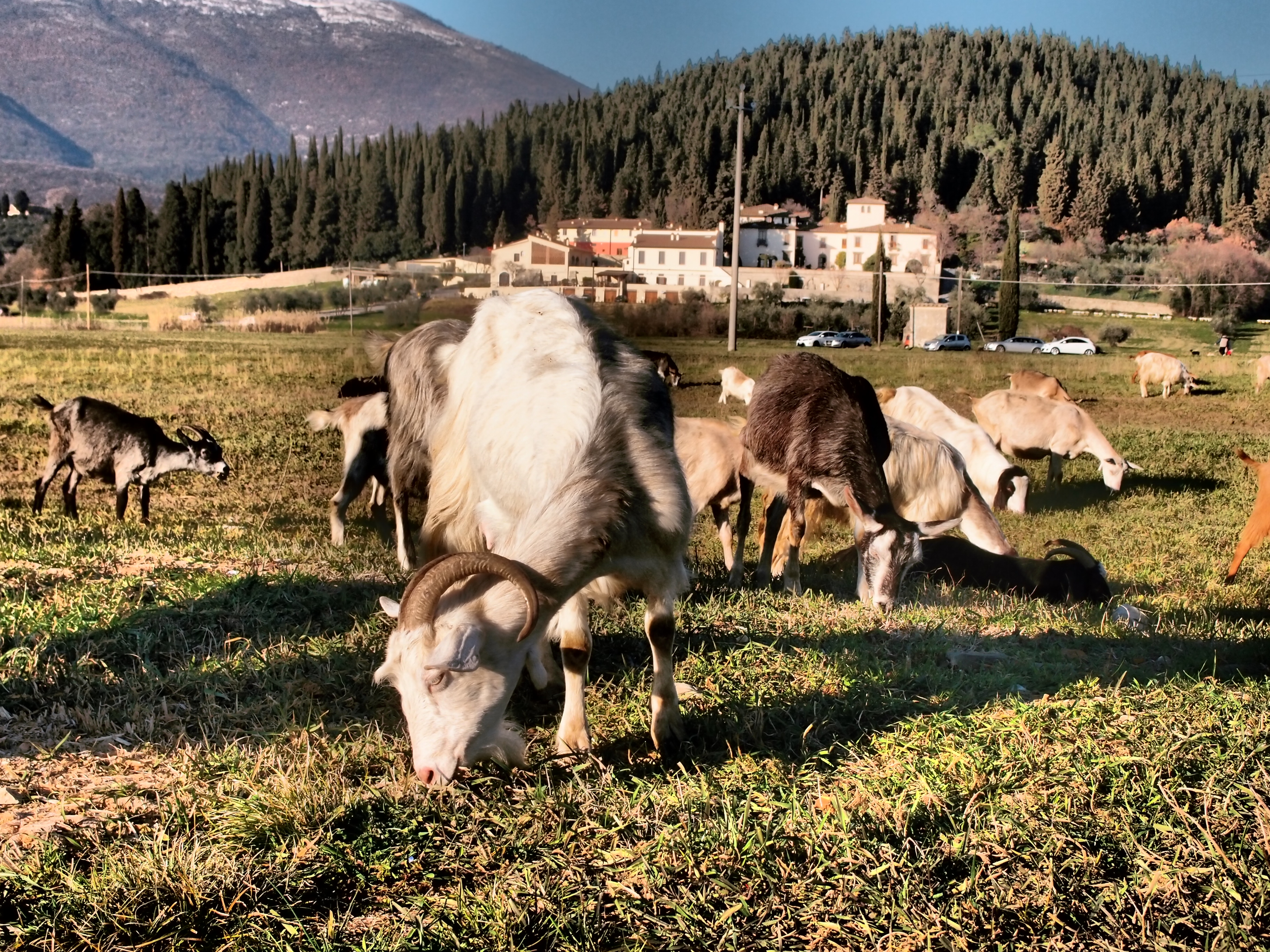 Innanzitutto, appena arrivati, ci imbattiamo in un gregge di capre che placidamente bruca l’erba, accompagnato da un bel cane da pastore che si distrae con i cani al guinzaglio della gente che passeggia: ma niente paura, perché le capre sanno esattamente dove fermarsi e poi il cane da pastore sta comunque attento a richiamarne l’attenzione al momento opportuno.
