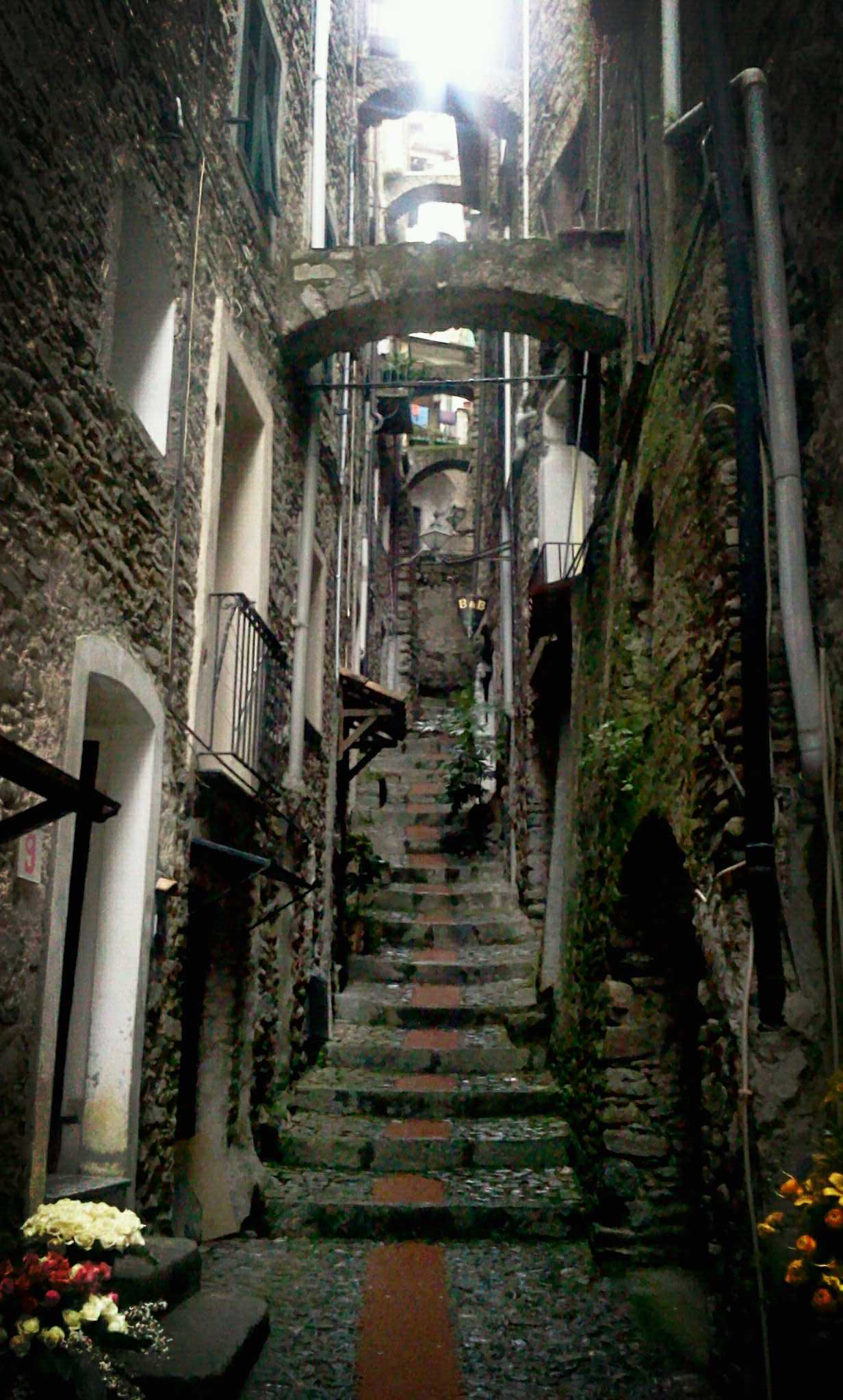 Primo passo importante: superare il ponte che collega la Dolceacqua bassa e “moderna” con la Dolceacqua medievale, tutta carrugi e case strette in pietra, addossate le une alle altre, attraverso le quali difficilmente filtra il sole. Ieri poi, con la pioggia, passare per questi vicoletti era ancora più tetro e buio, ma in ogni caso affascinante. Le pietre di questo paese parlano, raccontano storie che sono le storie dei Doria, gli antichi signori della regione, storie di sudditi che si ribellano e storie d’amore senza lieto fine… Sì, lo scenario meteorologico è proprio quello più adatto! Un tocco di colore comunque lo dà in questi giorni la manifestazione “carrugi in fiore”, per cui una serie di belle e colorate composizioni di fiori illumina e colora gli stretti vicoli del borgo.