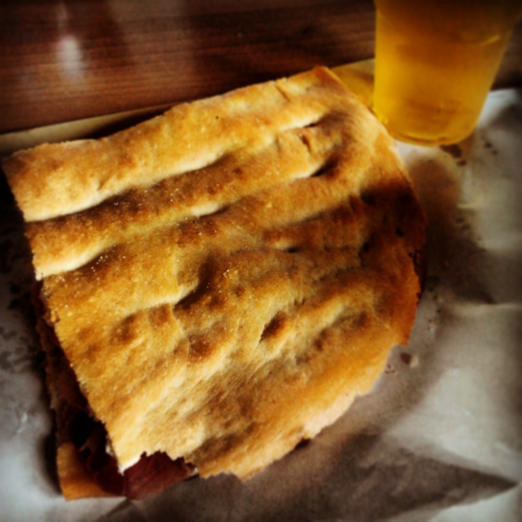 La schiacciata della Consuma è una specialità assolutamente toscana: di solito viene farcita con prosciutto e pecorino, ma si può mangiare anche nella variante coi funghi porcini, che pare sia una vera prelibatezza. Noi la prendiamo classica, crudo e pecorino: la schiacciata è sottile ma croccante, riempita al punto giusto, e considerato che son quasi le 2 del pomeriggio, addentarla è una vera soddisfazione. Ci sono molti avventori oggi allo chalet, per la maggior parte motociclisti che si fermano per una breve pausa prima di ripartire per nuove fantastiche curve.