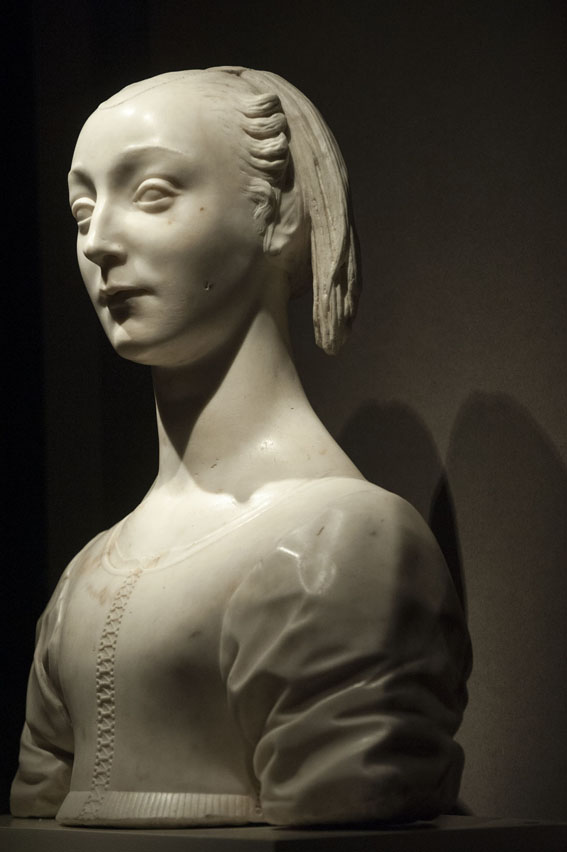 Infine, ultima opera davanti alla quale ci sediamo col nostro ormai inseparabile sgabello, il busto di Marietta Strozzi, realizzato da Desiderio da Settignano. Una giovane fanciulla della famiglia Strozzi, dunque padrona di casa, qui a Palazzo Strozzi, ritratta in un mix di realismo e di idealizzazione: anche qui il modello dell’antico è la base di partenza per nuove sperimentazioni nel campo dell’espressività. E il ritratto non è mai stato così vivo.