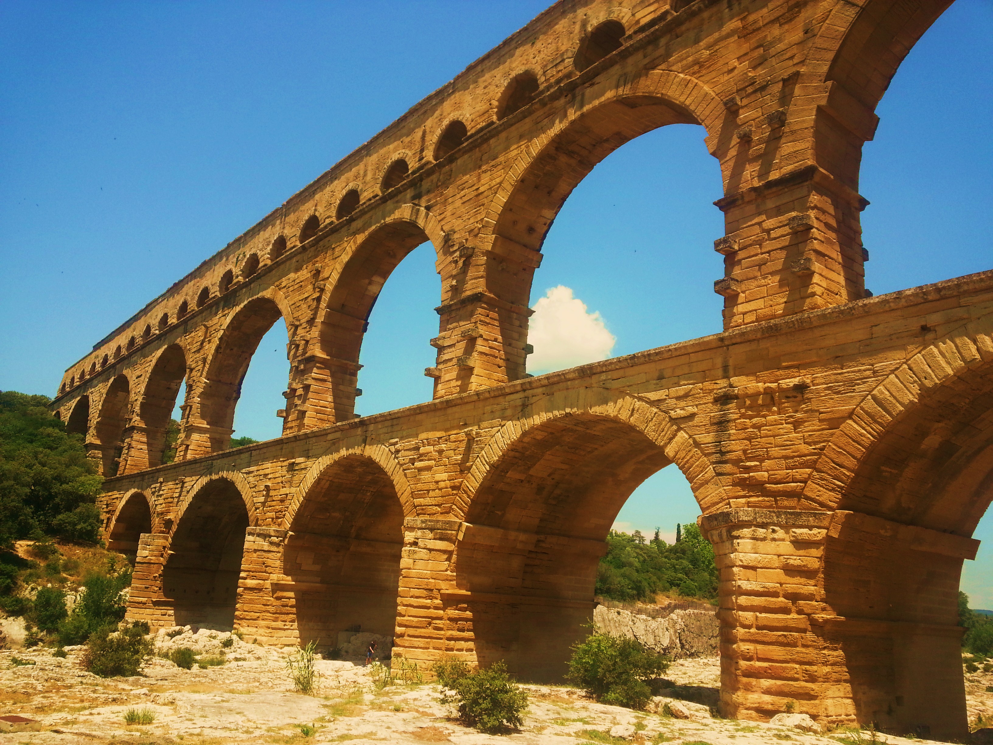 Pont du Gard ne ha visto passare di acqua sotto i ponti. E di acqua glien’è scorsa all’interno, visto che è un acquedotto romano. Un acquedotto davvero imponente, a 3 ordini di arcate, unico nella sua monumentalità ad essere sopravvissuto fino a noi e perciò tanto più prezioso. 3 ordini di arcate… tanto era il dislivello da superare, per colmare l’altezza delle pareti rocciose della gola scavata dal fiume. Mi immagino gli ingegneri romani all’opera: devono realizzare un acquedotto che corre per 50 km dalla sorgente alla città di Nîmes; corre, corre e poi, per forza si blocca: perché in mezzo scorre il fiume, c’è poco da fare, e quella gola profonda va superata, senza cambiare d’inclinazione al corso dell’acqua, la cui pressione all’interno deve rimanere costante, se non vogliamo che il condotto si spacchi e che tutto il lavoro vada perduto. I Romani non sono gente che si perde d’animo; non con queste imprese ingegneristiche. Serve realizzare un ponte di sostruzione? E si fa! Dev’essere a 2 piani? Va bene! Non sono sufficienti, ce ne vogliono 3? E che problema c’è? Basta fare qualche calcolo geometrico e conoscere bene le forze, in modo che gli archi soprastanti possano scaricare per bene il peso su quelli inferiori, realizzare infine l’ultimo piano in mattoni invece che in pietra, e il gioco è fatto! Ed è fatto così bene che il Pont du Gard, con i suoi 3 ordini di arcate sovrapposti è lì ancora oggi, perfettamente conservato, a guardia della gola.