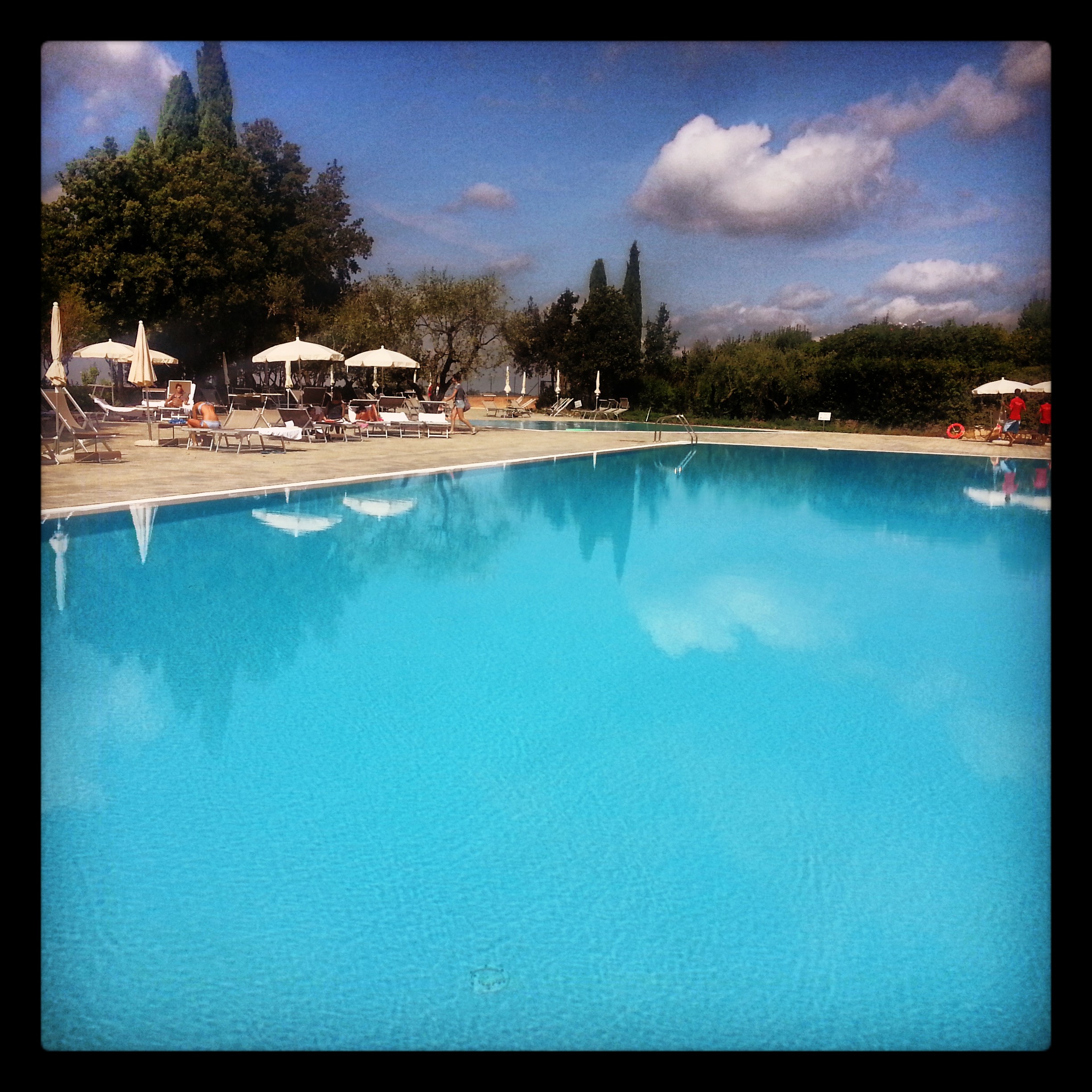 Oggi vedremo e proveremo praticamente tutto! E cominciamo con la mattinata in piscina. Le piscine guardano su un’amplissima veduta delle colline toscane che in questa stagione sono bruciate dal sole, e che si spandono davanti al nostro sguardo fino all’orizzonte. Le piscine non sono riservate esclusivamente ai clienti del Resort, ma sono aperte al pubblico, anche se i prezzi, certo, non sono proprio economici. Ma è indubbia la pace e la tranquillità in cui le piscine sono immerse, e sicuramente se si vuole passare una giornata rilassante a mollo nell’acqua è più facile farlo qui che in un’affollata piscina comunale…