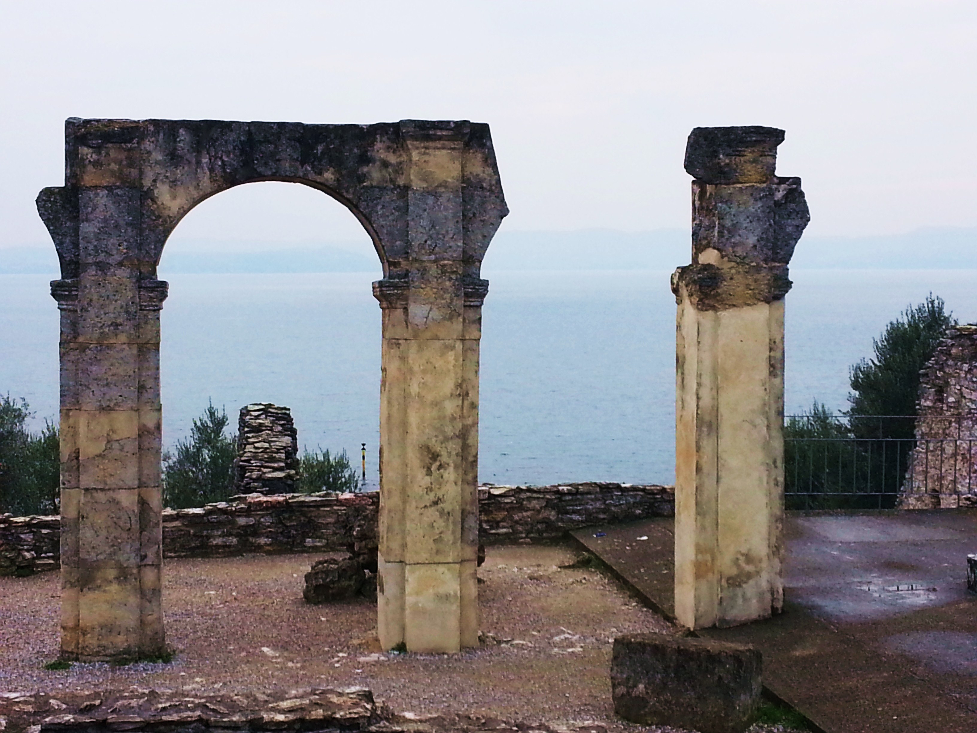 Del resto Sirmione ha molte più attrattive: non solo il castello, ma anche le cosiddette Grotte di Catullo e inoltre è una località termale. Nonostante il tempo grigio, qui ci troviamo bene: a pranzo ci trattiamo da signori alla Trattoria La Fiasca, dopo percorriamo la passeggiata panoramica sulla riva del Lago, che in una giornata tersa deve regalare emozioni incredibili, ma che oggi non permette di andare troppo in là con lo sguardo. Risaliamo poi per andare a visitare le Grotte di Catullo. Si tratta di un complesso archeologico paesaggisticamente incredibile: una villa, dunque una residenza privata, di età romana, appartenuta a qualche facoltoso personaggio che qui, fuori dalla città, aveva deciso di trascorrere le sue giornate nella pace e nella contemplazione di uno splendido panorama. Il nome di Grotte di Catullo fu dato a questo complesso all’epoca della sua scoperta, tra il 1500 e il 1600: le imponenti strutture murarie oggi visibili, infatti, erano completamente coperte da terra e macerie e chi le scoprì, percorrendo gli ambienti all’epoca interrati, le chiamò proprio per questo “Grotte”. Quanto a Catullo… beh, si sa che il poeta più romantico e famoso del mondo romano era di Sirmione: la suggestione era tanta e il nome di Catullo venne associato a questo grande complesso archeologico. Ma naturalmente di suggestione si tratta, non di altro. Come dicevo, le Grotte di Catullo di sicuro colpiscono il cuore di chi le visita, sia per la loro imponenza che per gli scorci che le sue arcate gigantesche creano sul lago; inoltre è immersa negli ulivi, e anche questo dà un senso di bello di non poco conto. Le strutture conservate poi sono impressionanti: alte arcate fronte lago, che oggi lasciano appena intuire l’imponenza dell’edificio e degli ambienti che sostenevano: come una grande terrazza, che bisogna immaginare guardasse dall’alto l’enorme specchio d’acqua circostante. Il nostro dominus romano se la passava parecchio bene, non c’è che dire!
