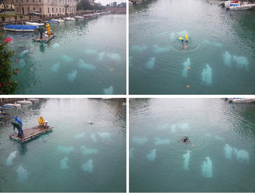 Peschiera del Garda forse d’estate è una ridente località turistica sul lago: ce lo rivela il parcheggio vicino al porto, che costa la bellezza di 2 € l’ora (tariffa che d’inverno potrebbero anche sospendere, eh?). Comunque sia, d’inverno è decisamente deserta: gli stessi negozi e ristoranti sono chiusi il sabato mattina. Così, metti il clima rigido e triste, metti che in giro non c’era un’anima viva, sembrava di essere in un paese fantasma. Unica nota decisamente entusiasmante, va detto, è stato vedere in diretta i sommozzatori del Sub Club di Peschiera montare un presepe sommerso nel lago: non capita tutti i giorni, in effetti, di vedere attività di questo tipo. E noi ci siamo goduti lo spettacolo.