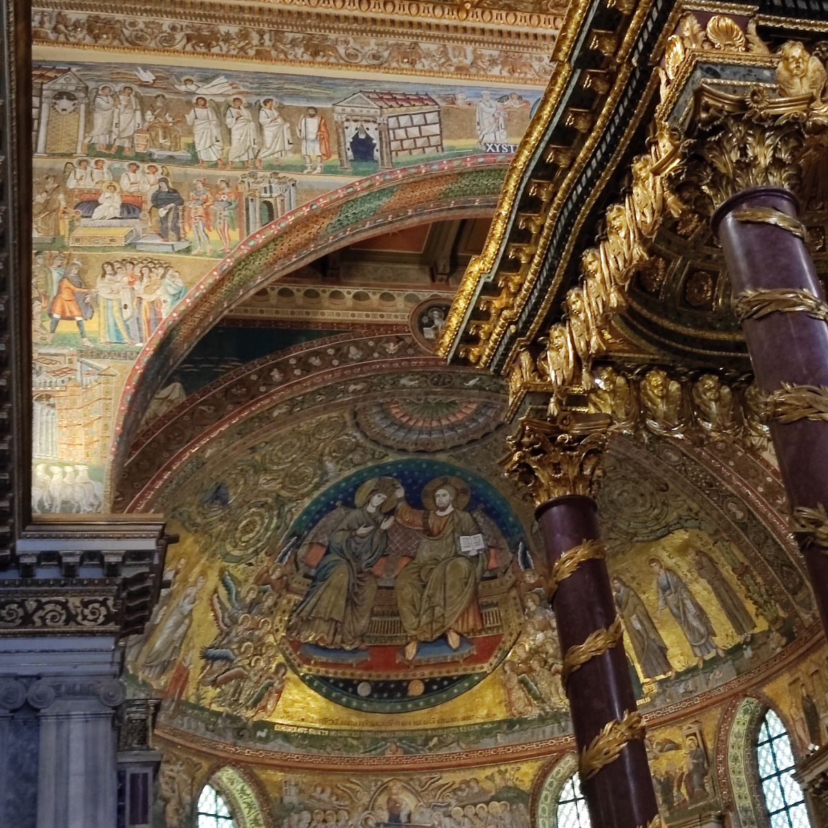 A pochi passi dalla Stazione Termini, sul colle Esquilino, sorge Santa Maria Maggiore. È una basilica papale, in quanto durante il giubileo viene aperta una porta, la Porta Santa, che resta aperta per tutta la durata del Giubileo, mentre il resto del tempo è sempre chiusa. Santa Maria Maggiore nasce come basilica paleocristiana: lo si riconosce dall’abside, decorato a mosaico. Davanti all’altare, un ciborio indica che al di sotto si trova una reliquia importante per la religione cristiana: il legno della culla della natività.