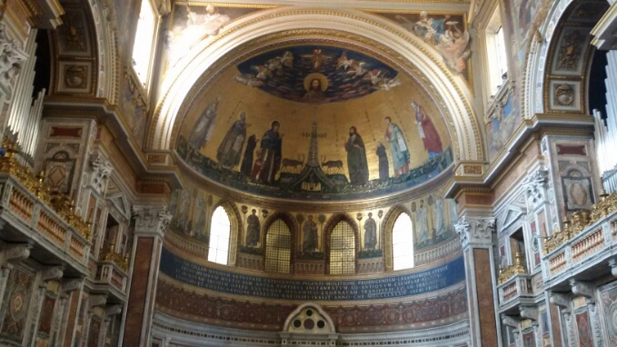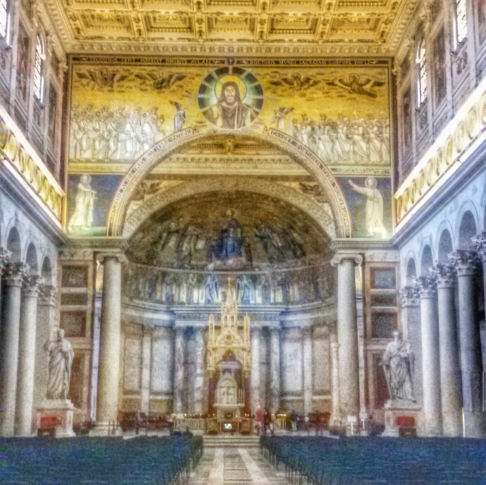 Tutte le chiese di cui ho parlato hanno in comune le antichissime origini. Di alcune, come San Pietro, non si coglie più nulla, e nulla rimane della basilica costantiniana, voluta appunto dall’imperatore Costantino che la volle edificare sulla tomba di Pietro. Santa Maria in Trastevere ha mantenuto il suo aspetto di chiesa paleocristiana, poi rinnovata nel XII secolo, con la facciata decorata da un mosaico e un nartece, ovvero uno spazio porticato, che introduce alla chiesa vera e propria. La chiesa sorge nel cuore di Trastevere, quartiere dal quale è lontana la Roma monumentale, ma tutto assume una dimensione più intima, più a misura d’uomo. E anche la chiesa rispetta questa dimensione più intima, al centro della piazza sulla quale si affaccia. Nonostante ciò, al suo interno l’abside dorata è qualcosa che colpisce lo sguardo e l’immaginazione: è pura bellezza ed estasi.