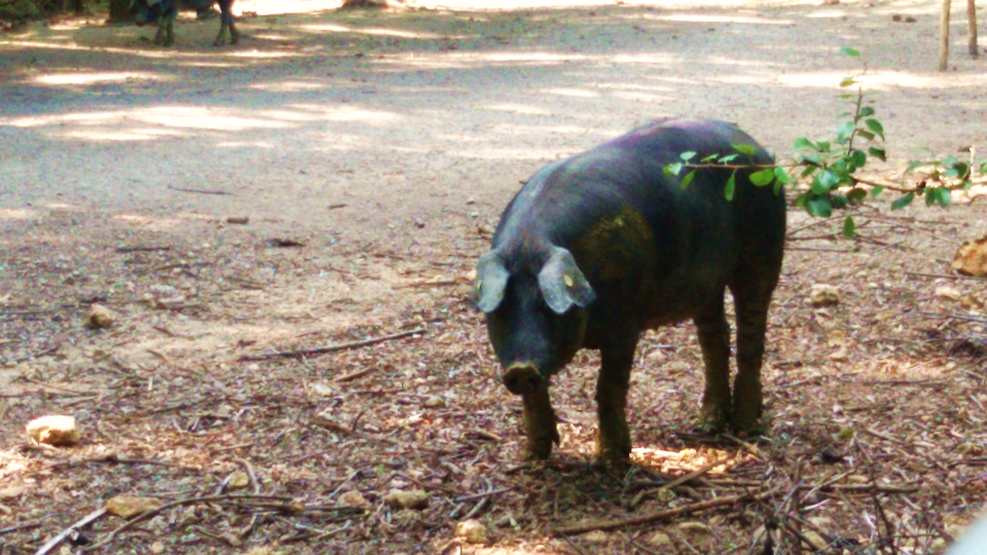 Innanzitutto ci imbattiamo in un allevamento di maiali di Cinta Senese: vivono allo stato brado in una querceta, hanno tantissimo spazio a disposizione e sono tantissimi; i loro grugniti riempiono l’aria, mentre grufolano nella terra fangosa. Vederli fa un certo effetto, perché sono abituata a pensare ai maiali che stanno ad ingrassare nei loro stretti recinti, non a bestie che corrono nel bosco di querce.