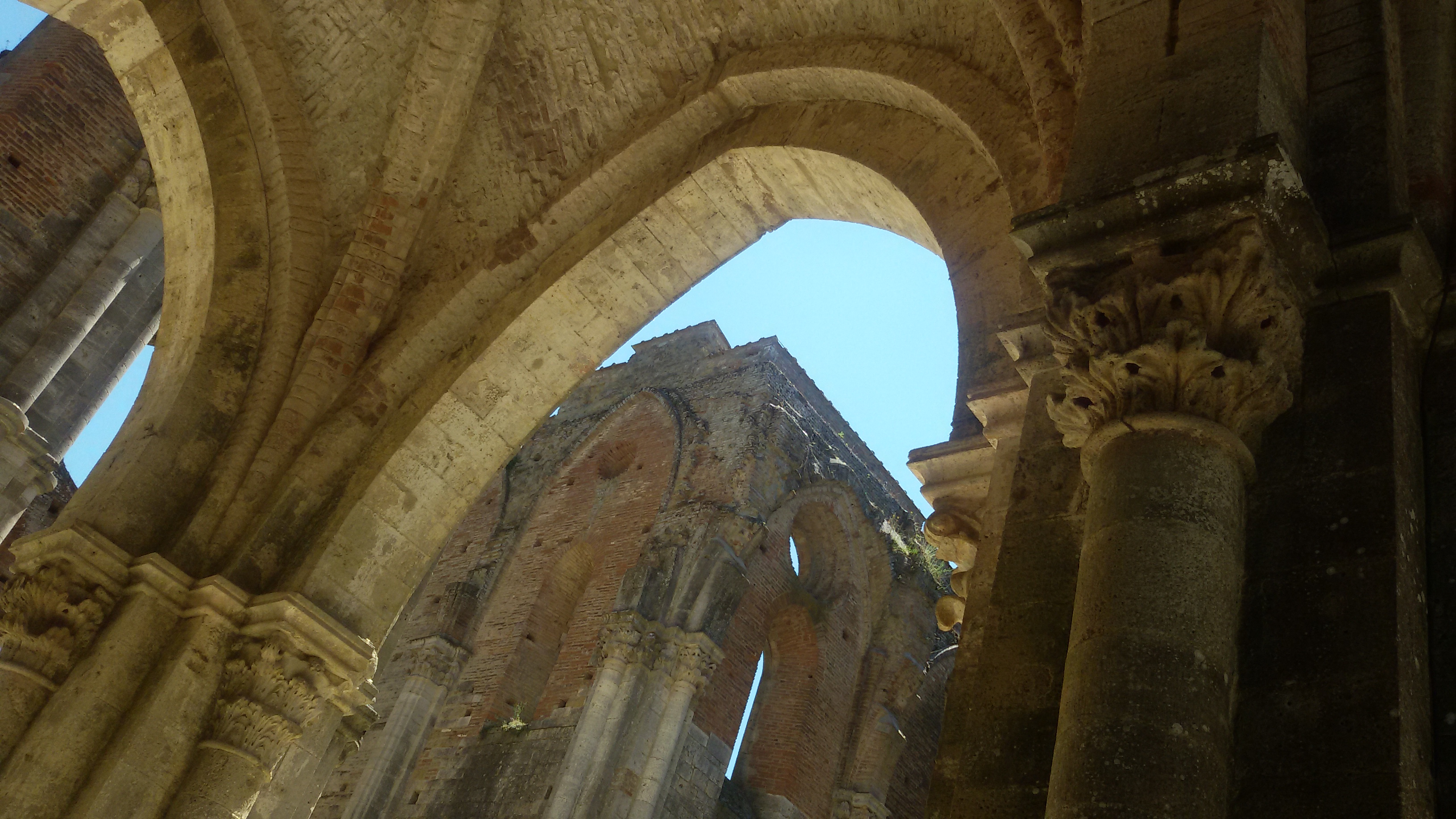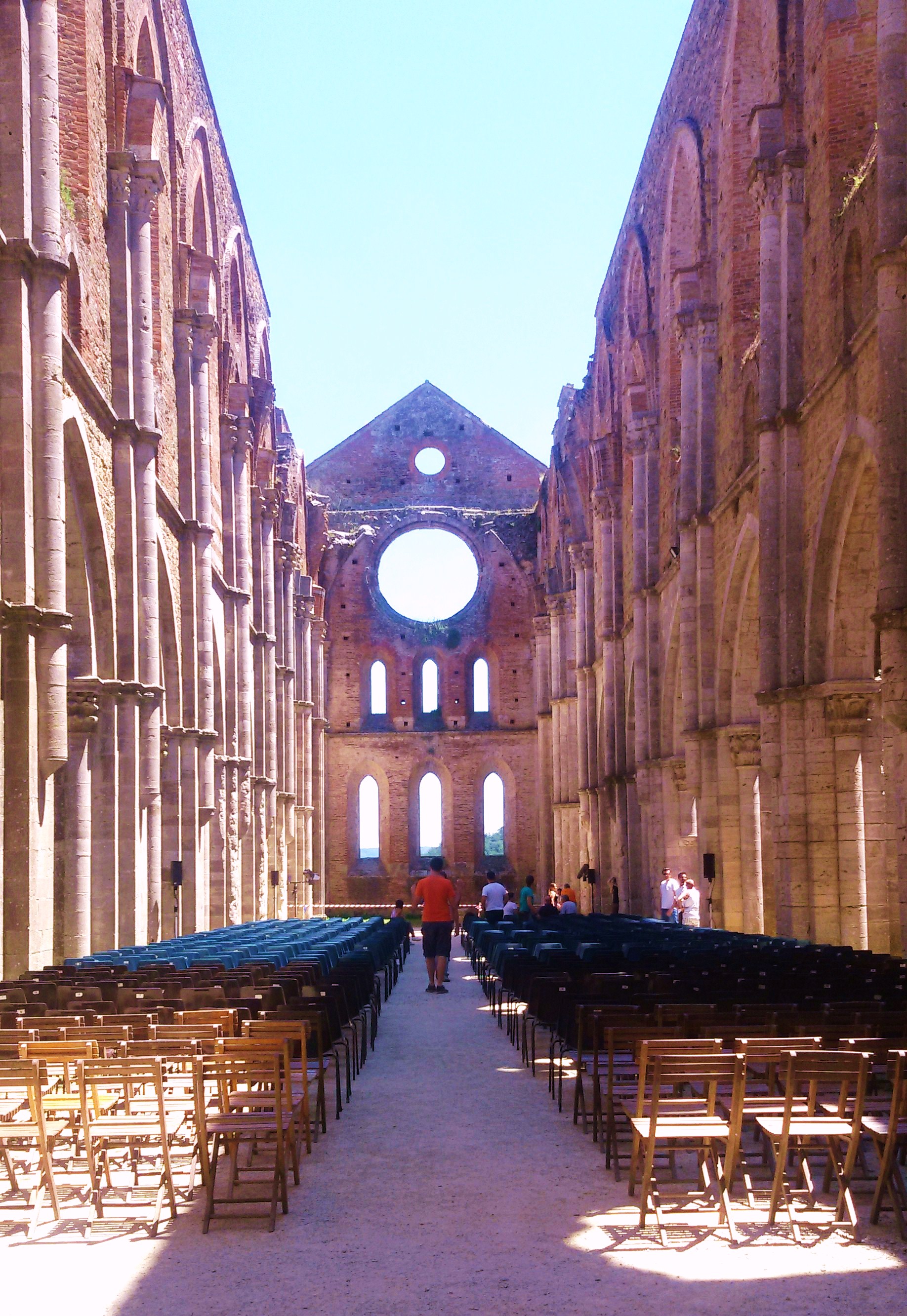 Raggiungiamo San Galgano dopo pochissimi km e la troviamo lì davanti a noi, immersa nel giallo dei campi di grano ancora da mietere. Abbazia tanto imponente quanto sfortunata, San Galgano sarebbe un capolavoro di architettura gotica se non fosse che il suo tetto, crollato anticamente, ne ha decretato da un lato il suo totale abbandono e dall’altro è stato complice del suo fascino. Costruita nel XIII secolo lungo una via di comunicazione importante per il trasporto dei metalli estratti dalle non lontane Colline Metallifere, e vicino al luogo di culto in cui si trovava la spada conficcata nella roccia da San Galgano, l’eremo di Monte Siepi, cominciò ad avere i primi problemi strutturali nel XIV secolo, ma è a metà del ‘700 che un fulmine colpisce il campanile facendolo crollare sul tetto che rovinosamente crolla. Il Monastero era stato comunque già abbandonato, e tale rimase finché non si decise di recuperarlo, puntando proprio sul fascino romantico delle rovine medievali abbandonate.
