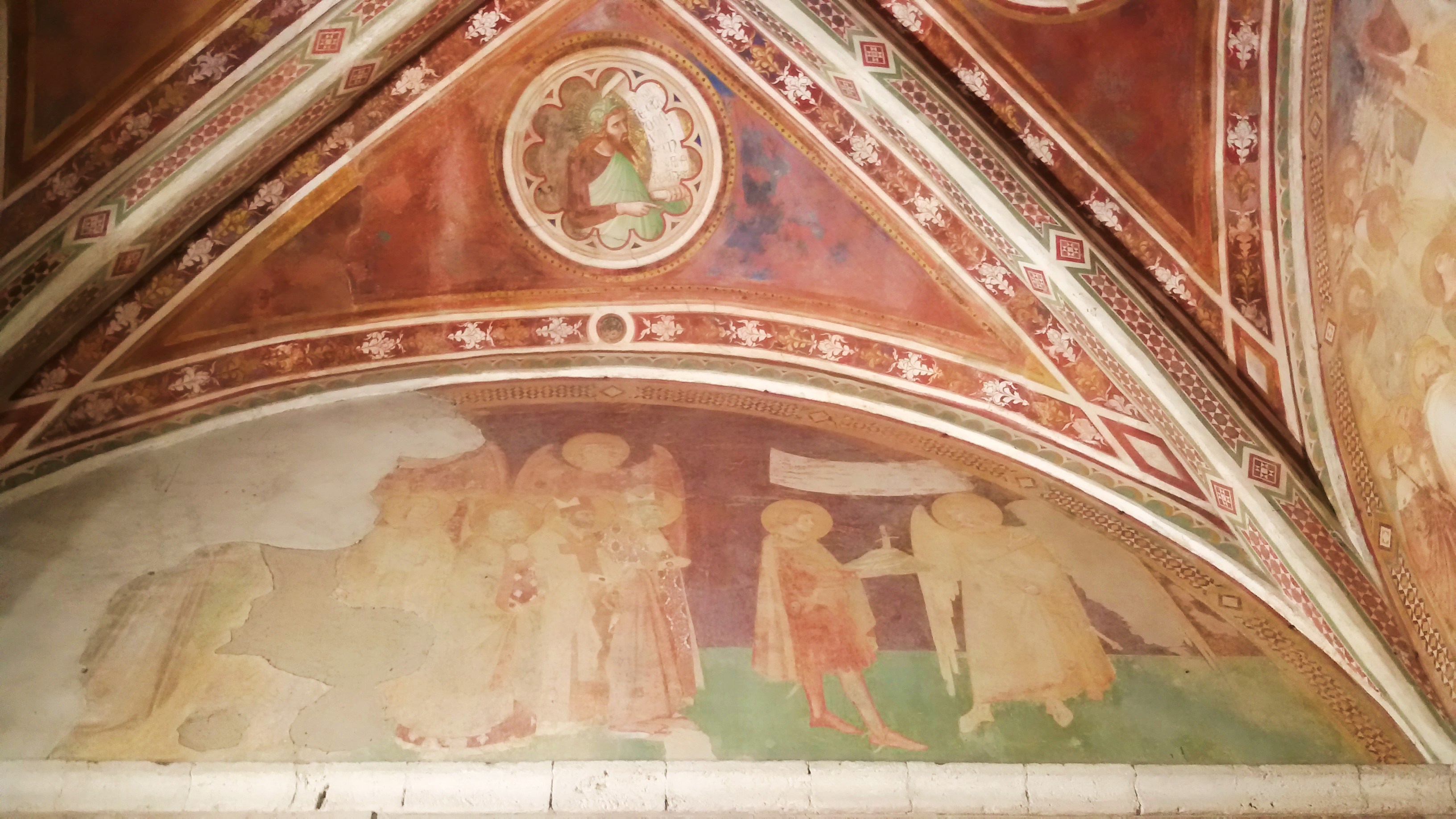 Nella piccola cappella a lato è affrescata da Ambrogio Lorenzetti la storia di San Galgano, mentre nel bel mezzo dell’aula si trova la spada conficcata nella roccia, oggi come allora, protetta da una teca per evitare che qualche simpaticone voglia giocare ad Excalibur provando ad estrarla dalla roccia. Da quassù si domina il panorama della vallata; il giallo dei campi di grano abbaglia, mentre in lontananza a malapena si distinguono le colline, per via della foschia del mezzogiorno.