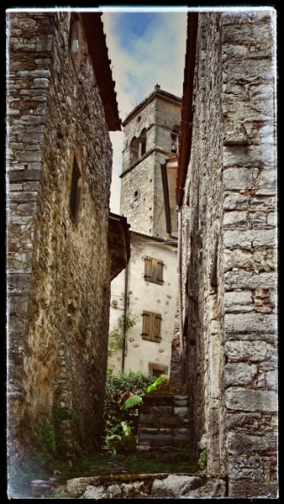 Dà proprio l’idea del borgo di montagna isolato, e la struttura stessa del borgo, medievale, conferma il suo carattere di estremo isolamento: il borgo è addirittura fortificato (mi chiedo chi poteva avere interesse a conquistare questo luogo), la chiesa, anch’essa risalente al 1260, come quella di San Romano, pare più una fortezza che un edificio religioso: si trova sull’estremo sperone roccioso, rivolto verso la montagna, che qui ha una parete verticale particolarmente impressionante; la chiesa, o meglio la torre/campanile domina il paese.