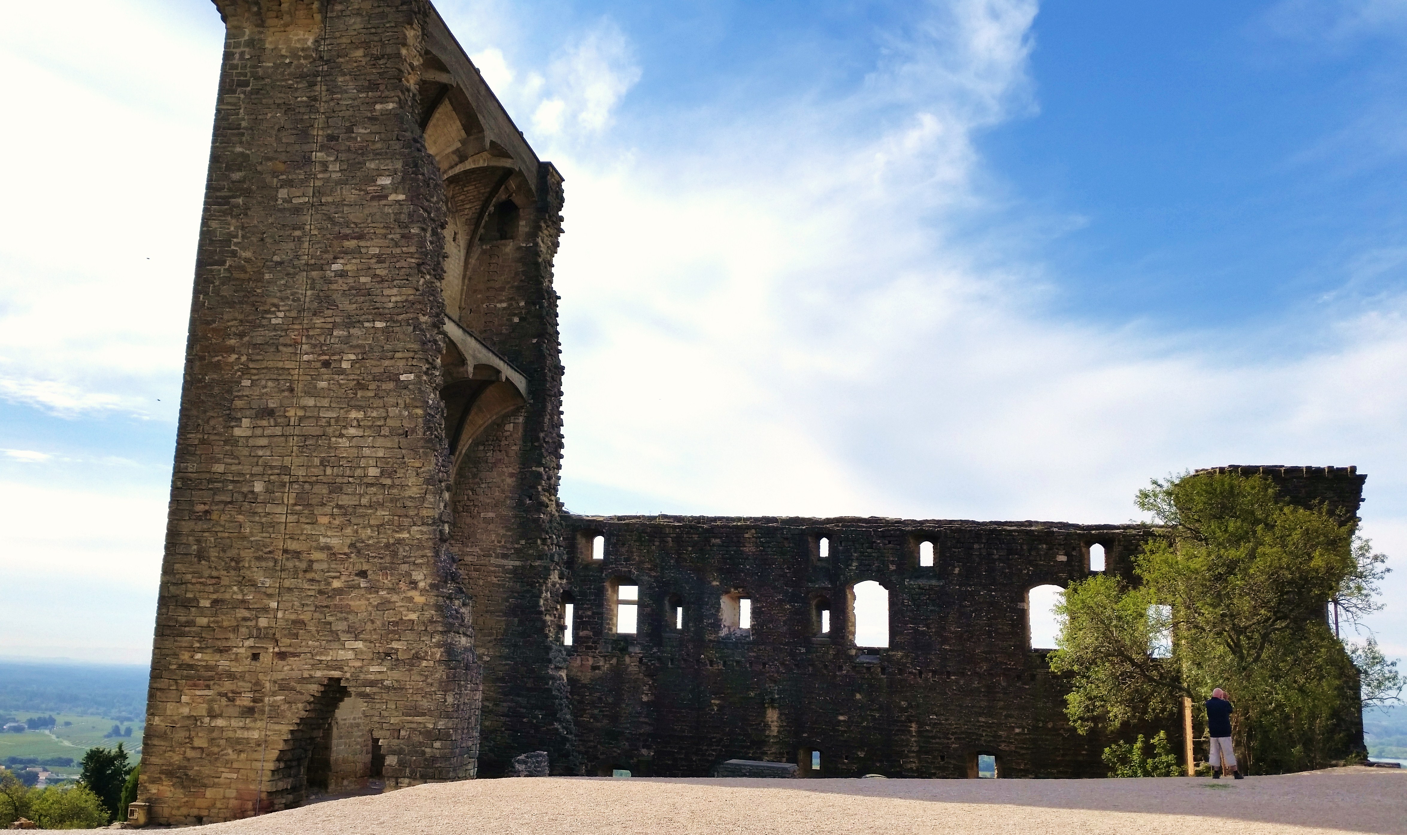 Nello spazio di pochi km abbandoniamo la città dei papi, la ricca e bianca Avignone con le sue mura possenti, le sue chiese gotiche, il maestoso Palazzo dei Papi, e risaliamo lungo la piana del Rodano fino a che non compaiono i disegni precisi e ordinati dei filari di vite. Siamo nelle terre denominate Côtes-du-Rhône, terre di vini nobili e di eccellente qualità, come lo Châteauneuf-du-pape. Questo vino in particolare prende il nome dal piccolo borgo, posto in altura a controllo dell’ampia vallata del Rodano, che fu scelto dai papi avignonesi come residenza estiva. Si deve a papa Giovanni XXII la costruzione della fortezza, sulla sommità del borgo, scelta come residenza: è questa il “castelnuovo” che dà il nome al borgo che gli sorge intorno. Oggi rimangono a malapena due pareti in piedi. Buffo, perché sembra una quinta teatrale, una parete dietro la quale non c’è nulla. E invece all’epoca doveva essere una rievocazione in piccolo del fasto del Palazzo di Avignone: non vorrete che i papi d’estate conducessero una vita frugale! Ma, come per il Palazzo dei Papi, la storia sa prendersi beffe dei potenti, e laddove un tempo era lusso e ostentazione di potenza e ricchezza, oggi non rimane che polvere e vuoto. Vuote sono le ampie sale del Palazzo di Avignone, completamente distrutte quelle di Châteauneuf-du-pape. Da qui, però, si gode una vista a tutto tondo sulla regione; da qui il Rodano sembra una serpe d’argento nel mezzo della piana.