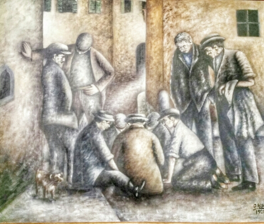 Andando avanti si entra nel nucleo più prezioso, forse, di opere d’arte: quelle appartenenti alle fondazioni bancarie. Qui il Gioco della Toppa di Ottone Rosai è messo a confronto e contrasto con La Scuola di Felice Carena: nel primo Rosai sceglie di dipingere un ritaglio di vita quotidiana, un gioco fatto per le strade di Firenze tra case fatiscenti da persone comuni. Rosai eleva il soggetto quotidiano a dimensione monumentale, ponendosi in tacita opposizione con i temi demagogici fascisti del tempo (siamo nel 1928) di elevazione dell’italianità e della romanità. Più adeguato a schemi vicini all’ideologia del Regime è l’opera di Felice Carena, professore di figura all’Accademia di Belle Arti di Firenze. Nel suo dipinto lo vediamo ritratto proprio ad una lezione di rappresentazione dal vero di Nudo insieme ad amici o allievi della Scuola. La figura centrale, la donna nuda, è molto classica nella posa distesa e nelle forme, e la rappresentazione va tutta nella direzione della Grande Raffigurazione tipica del Periodo.