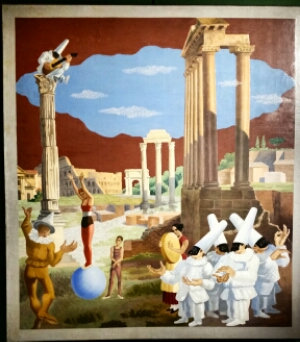 L’opera che però mi garba di più e che, lo ammetto, è quella che mi ha invogliato a visitare la mostra, è L’Equilibriste di Gino Severini: una reinterpretazione delle antichità del Foro romano che vengono calate in un contesto da commedia dell’arte e da circo: l’equilibrista al centro della scena, vari Pulcinella qua e là, pure in cima ad una colonna sulla quale, solitamente, si trovava la statua della divinità: un gioco di equilibri e di contrasti tra l’idea dell’immagine da cartolina, del gioco e dell’irriverenza. Il pannello fu realizzato insieme ad altri pannelli con analogo tema, per arredare un ambiente della casa del collezionista Rosemberg, di Parigi, un mecenate protettore di vari artisti di quel tempo.