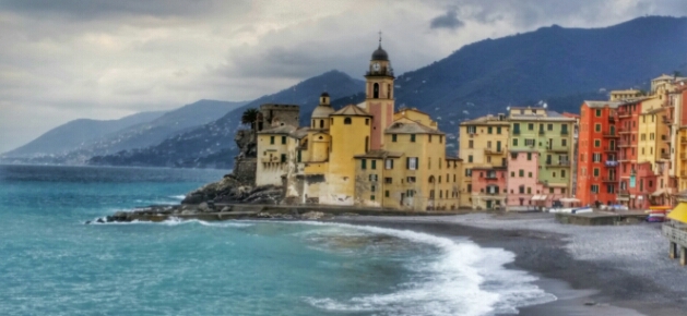 La spiaggia di Camogli, d’estate zeppa di bagnanti, ora è patria dei gabbiani. Volano, atterrano, compiono volute nel cielo, gridano, planano, si tuffano a caccia di qualche pesciolino. Il mare è agitato, qualche onda arriva a lambirci i piedi sul molo su cui poggia l’abside della chiesa che, spalle al golfo, non pare curarsi delle intemperie. La passeggiata che corre lungo la spiaggia è una piacevole terrazza tra il mare e le quinte variopinte dei palazzi che si affacciano su di esso, nei quali si aprono ristoranti, gelaterie, locali che ci ricordano quanto questa località d’estate sia vissuta, e voglia fare la pretenziosa: Santa Margherita Ligure, e Portofino ancora di più, sono mete d’élite troppo vicine perché non esercitino fin qui la loro influenza.
