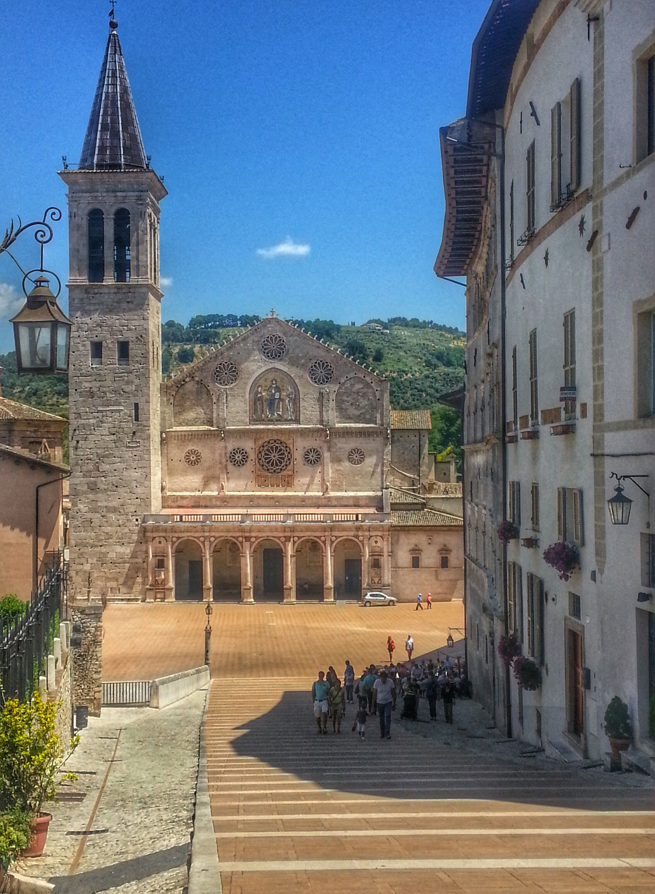 Todi ci accoglie nel pomeriggio inoltrato. Nella grande piazza centrale, sulla quale affaccia sia il palazzo medievale del potere civile, che la cattedrale, ci affascina proprio quest’ultima, posta in alto, in cima a una scalinata, e con la facciata quadrata, così particolare: sembra tronca, tagliata, invece (scopriremo poi) è una caratteristica comune a molte chiese umbre.