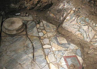 La visita prosegue poi negli altri ambienti della domus, che era davvero molto grande: si fa fatica a chiamarla casa, era piuttosto un villone nel cuore del centro di Roma! I proprietari appartenevano senz’altro alla Roma bene, e se anche non abbiamo testimonianze di oggetti di lusso, tuttavia, basta guardarsi intorno per capire qualcosa del loro status sociale: pavimenti in marmi policromi intarsiati, ovvero in lastre di marmo colorato, rosa, giallo, verde, bianco, sistemati a disegnare geometrie bellissime i cui colori sono ancora vividi nonostante i segni del tempo e i secoli di obliterazione nelle cantine di Palazzo Valentini. Sono due le domus, e se una ha i pavimenti in marmo, l’altra non è da meno, perché ha i pavimenti in mosaico. Nel Cinquecento, le fondazioni del palazzo spaccarono a metà proprio uno dei mosaici, ma se ne intuisce ugualmente la bellezza.