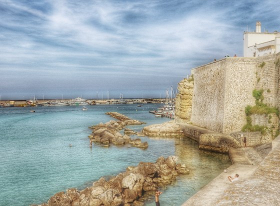 Quando torniamo alla luce passeggiamo per Otranto, bellissima, con le sue casette bianche che mi ricordano, non a caso, l’altra sponda dell’Adriatico. Quindi, ci rechiamo al Castello Aragonese, la fortezza a difesa della città e del Canale d’Otranto, oggi sede espositiva e punto panoramico, ma all’epoca luogo del potere e della difesa: le sue stanze hanno pareti spessissime di pietra, con lunghe bocche per i cannoni al posto delle finestre. Oggi, il Castello ospita mostre temporanee (da metà giugno una mostra su Caravaggio) e presenta i reperti provenienti dalla Grotta dei Cervi di Porto Badisco, nota per le sue pitture rupestri, ma non aperta al pubblico.