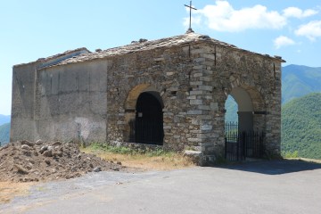 Incontrate, quale prima forma della presenza dell’uomo, la piccola cappella di San Bernardo. San Bernardo era nel Medioevo il patrono dei viandanti. Così, non stupisce che essa sia intitolata proprio a questo santo: l’architettura è molto semplice, e tipica delle chiesette di campagna liguri: un’aula unica, il tetto a spiovente, l’ingresso coperto da un ampio portico completo di panchine, in modo da concedere il riposo a chi, camminando, giungeva qui nei pressi. Nella facciata, solitamente si aprono due finestrine ed è da queste che si può spiare l’interno, visto che la chiesa è chiusa: la cappella di San Bernardo è affrescata su entrambe le pareti lunghe: sono rappresentate le vicende della passione di Cristo e poi su un lato le sette virtù teologali, sull’altra, in una magnifica rappresentazione, i sette vizi capitali, immaginati come personaggi maschili e femminili ben vestiti e a dorso d’asino, incatenati gli uni agli altri che inevitabilmente finiscono nelle fauci aperte di un drago/demonio. Proprio al di sopra di questa drammatica rappresentazione, in netto contrasto ideologico, sta la figura del Cristo risorto, al quale i viandanti e i pellegrini devono affidarsi se non vogliono finire divorati da Satana. Gli affreschi risalgono al Quattrocento e sarà curioso scoprire, alla fine di questo percorso, che la stessa raffigurazione dei Vizi Capitali si ritrova nel Santuario della Madonna Bambina di Rezzo.