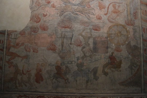 Questa chiesa romanica è molto ben conservata; soprattutto, conserva sulla parete destra due cicli pittorici notevoli. Uno, il più antico, risalente al primo Quattrocento, raffigura il Giudizio Universale: vi è raffigurato Satana con il volto mostruoso di Bes e le gambe aperte, un dannato condannato ad essere cotto allo spiedo, un altro è condannato alla ruota, il tutto tra fiamme e fiammelle; sembra di sentire il fuoco scoppiettare e i dannati urlare tanto è vivida, anche se ingenua, questa rappresentazione. Alla base la cavalcata dei Vizi Capitali, nuovamente incatenati gli uni agli altri e sontuosamente vestiti, non possono non andare a finire in bocca al demonio affamato. Sopra le loro teste, a mo’ di didascalia è indicato chi è l’Ira, chi l’Avarizia, chi la Gola.