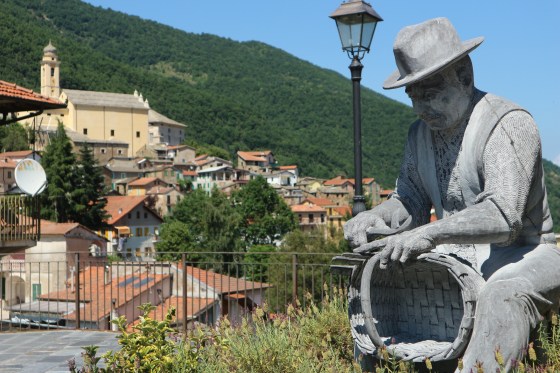 Il paese di Rezzo si trova più a valle rispetto al Santuario. La sua chiesa parrocchiale, col suo campanile, è comunque il monumento più eclatante, intorno al quale si dispone il resto del borgo medievale. La statua di un cavagnaro, ovvero di un costruttore di cavagni, cesti in legno di nocciolo col manico che si portavano sul braccio, ci racconta che gli abitanti di Rezzo ne erano abili costruttori.