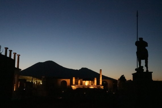 Tuttavia non si tratta di aver cambiato quattro lampadine e poco più, ma della creazione di un percorso integrato, visivo e sonoro, nel quale il visitatore viene coinvolto, immerso, avvolto. Le suggestioni che la città antica al chiaro di luna già da sola può dare vengono amplificate dalle voci narranti, che ci portano nella bottega di un panettiere lungo Via Marina, nella domus di Trittolemo, nel tempio di Apollo, per poi sbucare nella piazza del foro sul cui lato di fondo si staglia ciò che resta del capitolium dietro il quale l’inconfondibile silhouette scura del Vesuvio ci dice subito com’è andata a finire.