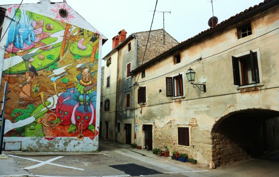 Dignano ci accoglie con il rumore del frantoio attivo all’ingresso del paese. È tempo di raccolta delle olive ed è tempo di olio nuovo; è tempo quindi di lavori a pieno ritmo, di negozi aperti e di aziende che organizzano tour di degustazione. Noi però preferiamo fare semplicemente un giro nel paese. Scopriamo un luogo pieno di contraddizioni: la streetart che caratterizza fortemente certi muri e che grida all’innovazione e alla voce giovane di chi cerca oltre le apparenze cozza con le vecchie scritte nostalgiche, in italiano, scritte sempre sui muri: fa tenerezza leggere “Viva Stalin” e tutti gli altri slogan inneggianti al potere proletario in rosso sugli intonaci grigi. Ma non è solo questo.