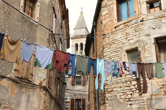 Rovigno è semplicemente bella. La percorriamo nel pomeriggio inoltrato, ci godiamo il tramonto sul mare sorseggiando una birretta (San Servolo, una buona bionda artigianale croata). Saliamo fino alla chiesa di Sant’Eufemia alla luce rossa di un cielo incendiato, quindi scendiamo e ci andiamo a perdere nei vicoli, tra le case antiche, i panni stesi su fili tesi tra un palazzo e l’altro, come se ci trovassimo in un paesello di tanti decenni fa. Eppure è proprio questo contrasto, tra la bellezza un po’ fighetta del frontemare e i vicoli oscuri e popolani che affascina terribilmente.