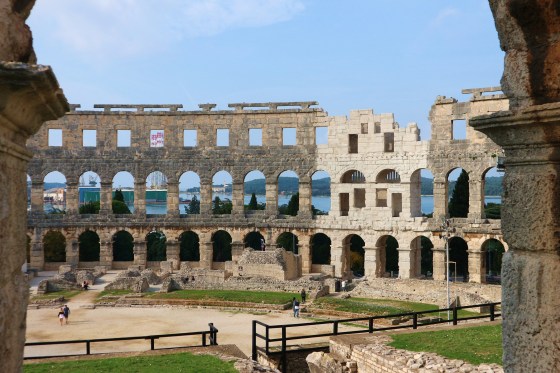 Pola, a pochissima distanza da Dignano, ci accoglie con la vista sul porto e l’isola di Brioni a poca distanza. Ma ciò che mi dà il benvenuto è l’anfiteatro romano. È davvero ben conservato: si mantiene tutto il muro esterno con le sue arcate, mentre l’interno, che un tempo ospitava la cavea, cioè le gradinate per il pubblico, è stato interamente abbattuto nel corso dei secoli. Oggi è una bellissima finestra sul mare: attraverso le sue arcate vediamo fino al porto e oltre. L’effetto scenografico è davvero notevole.
