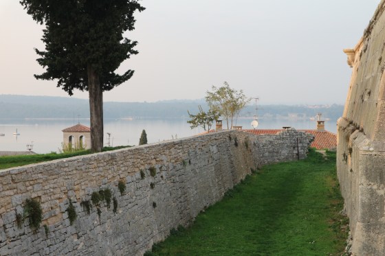 Proseguendo zigzaghiamo un po’ facendoci ispirare dalle stradine che incrociamo. È così che, volendo raggiungere la fortezza di epoca veneziana sulla cima della collinetta che domina Pola, ci imbattiamo nell’area archeologica del teatro romano, immediatamente alle spalle del grande edificio del museo archeologico, al momento chiuso per grandi lavori. Percorriamo un sentierino che non son sicura che si possa fare, ma che tutti percorrono, e arriviamo sul livello della fortezza. Questa, cinta da poderose mura e da un fossato invalicabile, offre una vista notevole sul mare e sulla città. Al suo interno ospita un museo navale. Ridiscendiamo e percorriamo alcune strade con begli edifici medievali che potrebbero benissimo trovarsi a Venezia per il loro stile architettonico. Qui l’influenza veneziana è stata davvero duratura, in effetti.