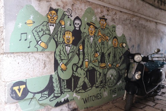 Murales si trovano sparsi un po’ ovunque in paese: sotto un passaggio voltato c’è un’orchestrina accompagnata da uno scheletro: fa molto funerale a New Orleans o forse, come noto anche in altri murales del paese, c’è una tendenza al ricreare atmosfere oniriche. Il borgo ha rischiato a lungo di diventare un borgo fantasma. Forse i murales riflettono proprio su questo.