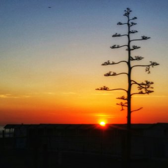 Non credevo di trovare tante persone, non solo ragazzi, ma coppiette di anziani e, sì, vecchiettini con le badanti, seduti presso il Pontile, chi sulla balaustra, chi sulle panchinette, a godersi l’ultimo sole e la brezza mite del mare. Il sole regala dei tramonti coloratissimi. I bagni, abbandonati nella stagione invernale, sono dei relitti che godono dei riflessi dell’ultimo sole. Così l’agave, che oggi riceverà l’ultimo raggio, domattina riceverà il primo.