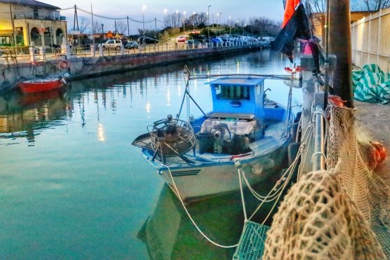 Un piccolo peschereccio in darsena, di fronte al Borghetto dei Pescatori di Ostia
