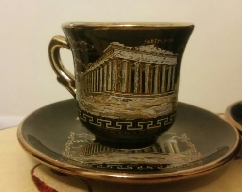 Le mie due tazzine da caffé di Atene, con tanto di Partenone rappresentato sopra, sono uno dei souvenir cui sono più affezionata in assoluto! Nere col disegno oro e bianco, con i decori a meandro che richiamano l’antica Grecia e il monumento principale di Atene. Anch’esse furono acquistate a Monastiraki. Va detto che ad Atene spesi un sacco di soldi in souvenir!