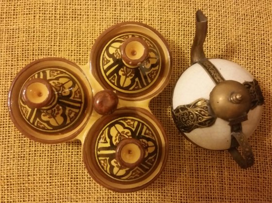 Un solo giorno a Tangeri e ho fatto danno! Ho portato via con me una teierina che non ha alcuna utilità pratica se non quella di essere bellina, una ciotola, che ha anche una sua utilità (oggi è riempita di conchiglie del mare d’inverno di Ostia) e un porta spezie che fa anche bella figura in tavola, in effetti. Io però preferisco tenerla lì sul tavolino, in esposizione: è bella, triplice, gialla. Mi mette allegria e mi ricorda di un mercato tangerino, di un mercante mezzo cieco e della sua commozione nel vederci acquistare solo dal suo banco.