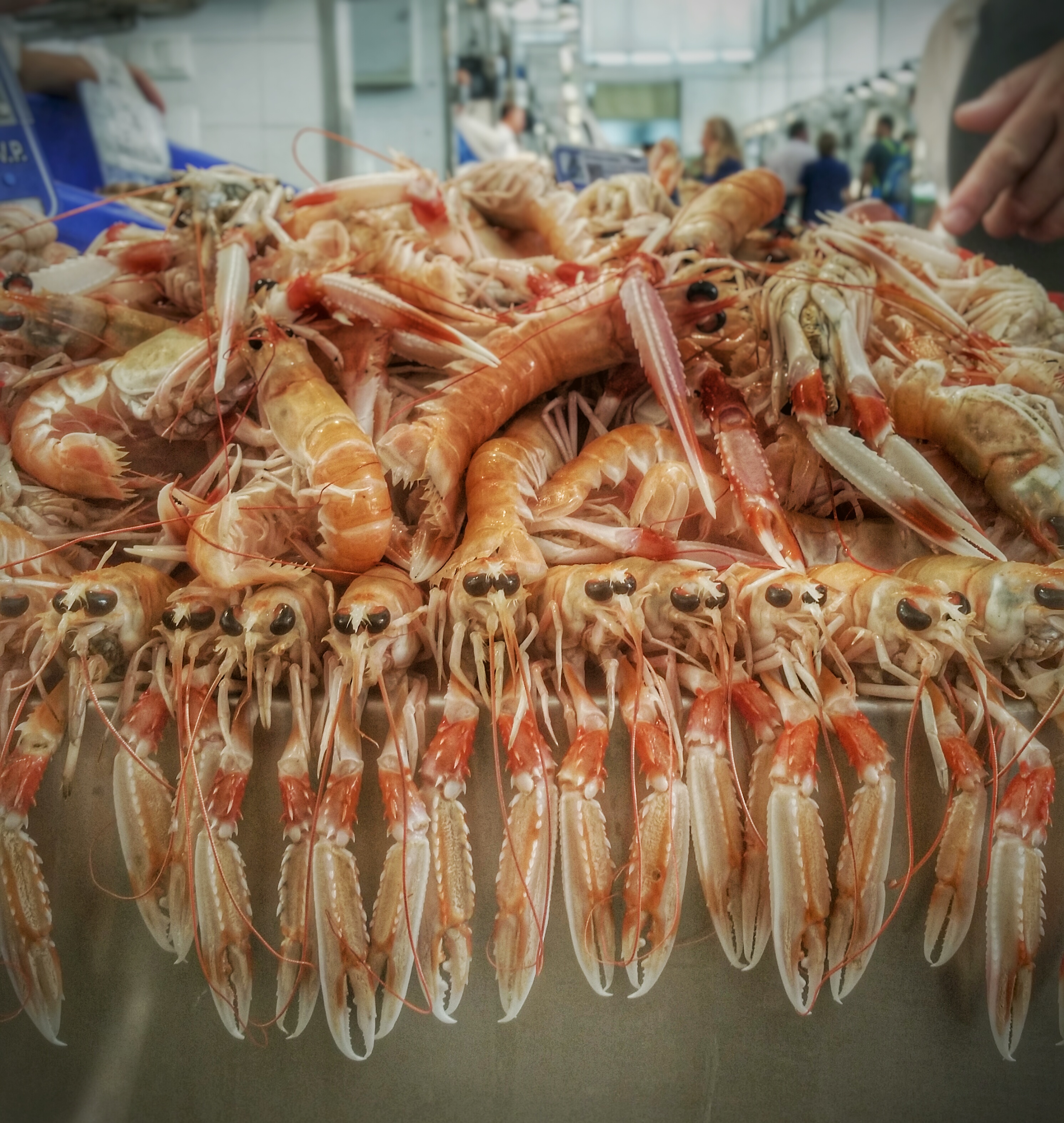 Gamberoni in posa per una foto di gruppo al mercato del pesce di Cadice